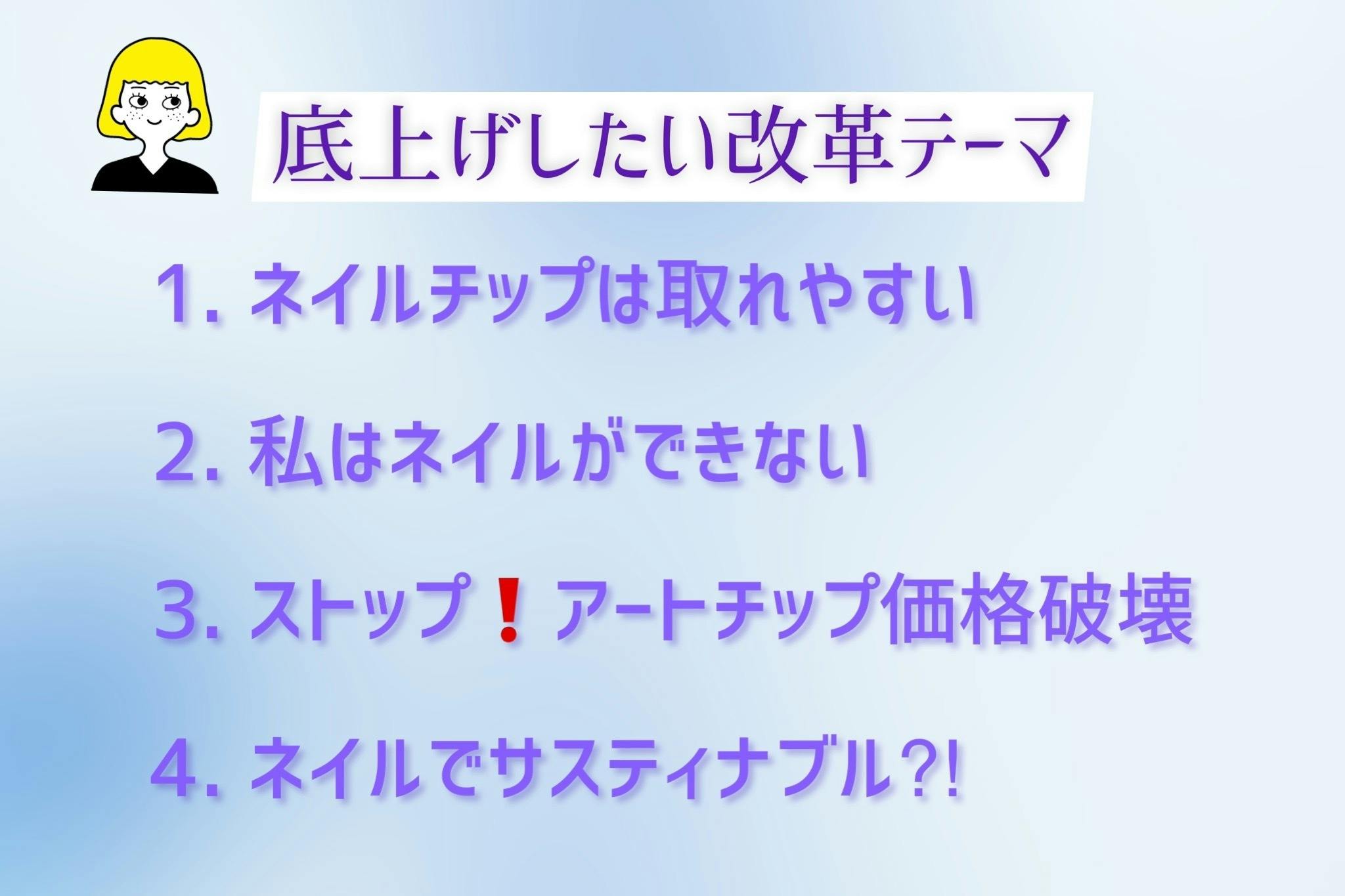 ネイルチップと聞いて『う~ん。。。』と思ってしまう人が持っているチップのイメージや問題点を解決し、ネイルチップの印象の改善を図りたい。