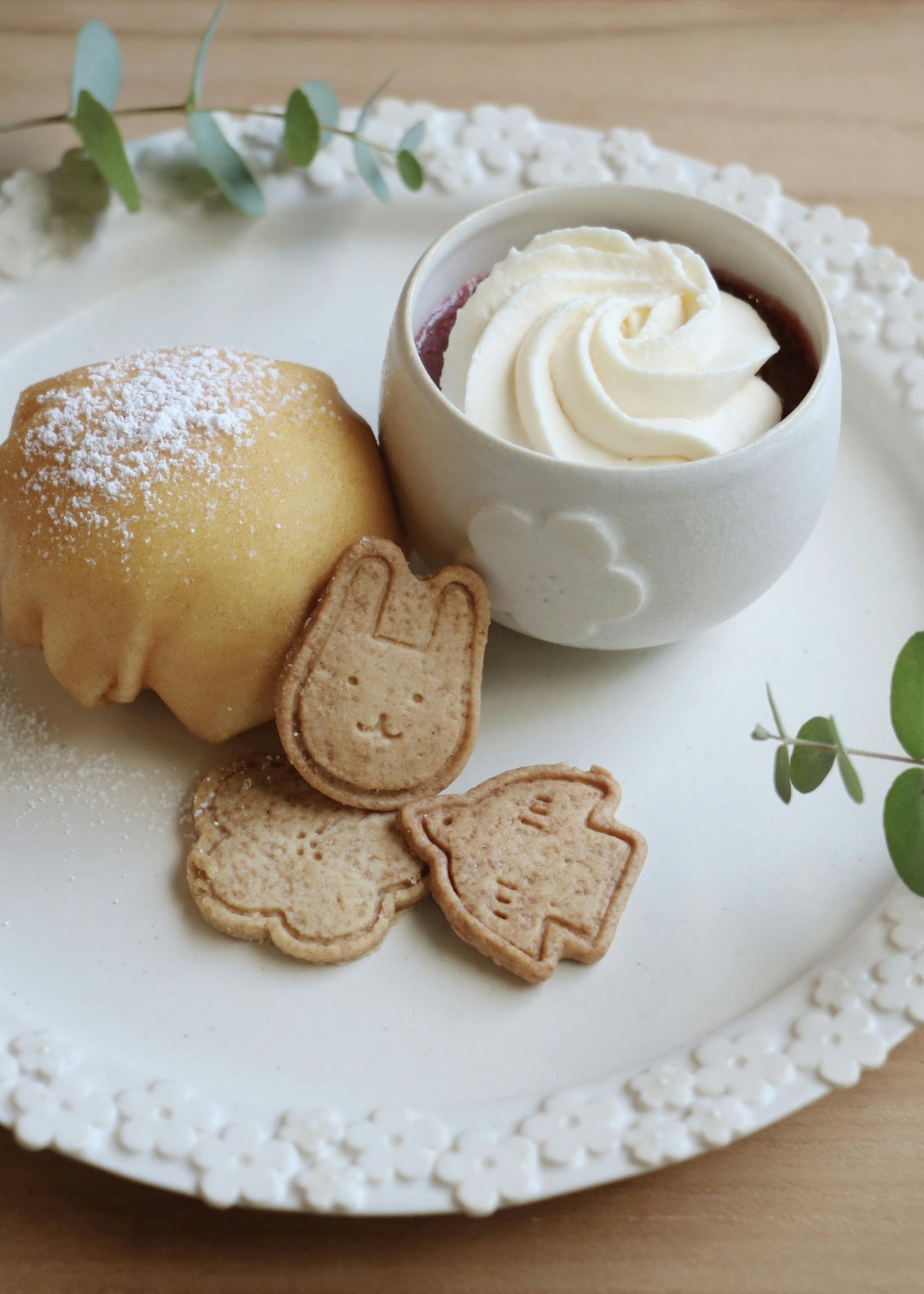 お皿クレープやパウンドケーキ、ムースケーキなどこだわりの詰まった器とお菓子が楽しめます。