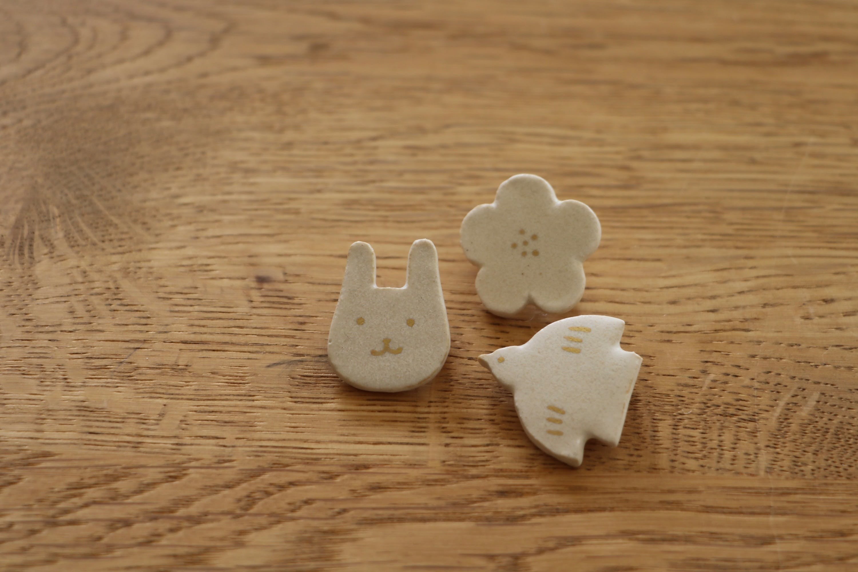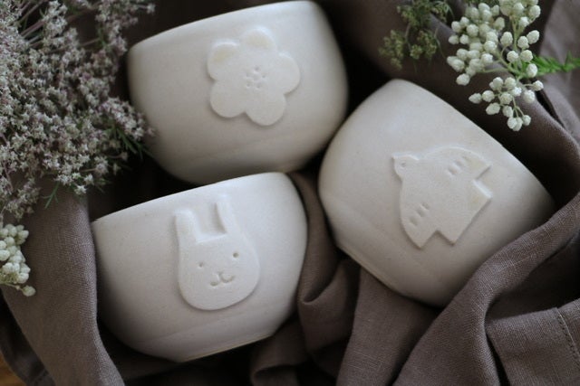 ふと壁面に花、うさぎ、トリの絵を書いた時、3つが揃ったマークが出来てこのマークをcafeで使おうと決めました。