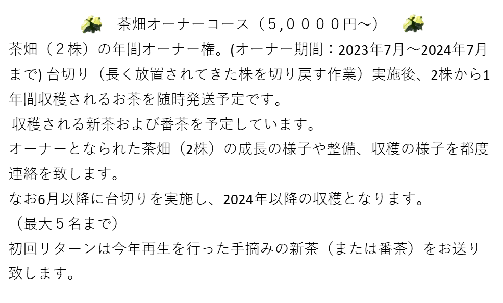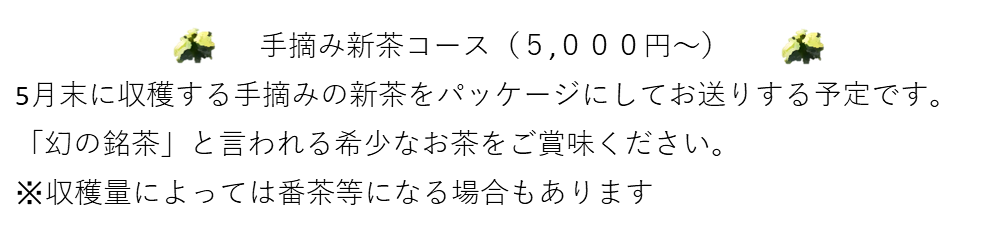 5月末に新茶の収穫を予定しており、希少な手摘みのお茶を収穫、製茶してお届け予定です。今回再生後初の収穫となるため、どの程度の収穫量が見込めるかわからない状況です。そのため収穫量が少ない場合は番茶、来年以降収穫によるリターンとなる場合がありますがご了承ください。