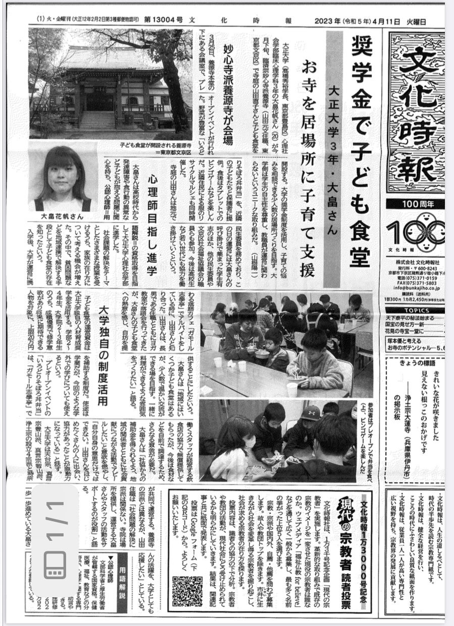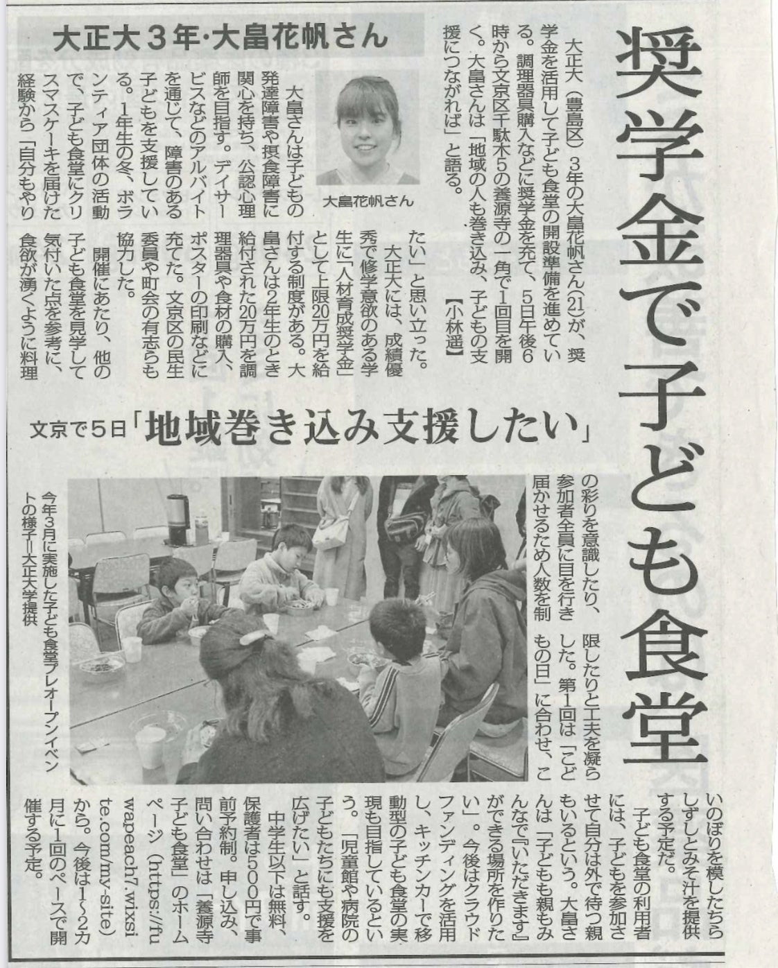私は、現在大学3年生、大学院進学を目指しながら文京区千駄木にある養源寺で子ども食堂の運営を行っております。