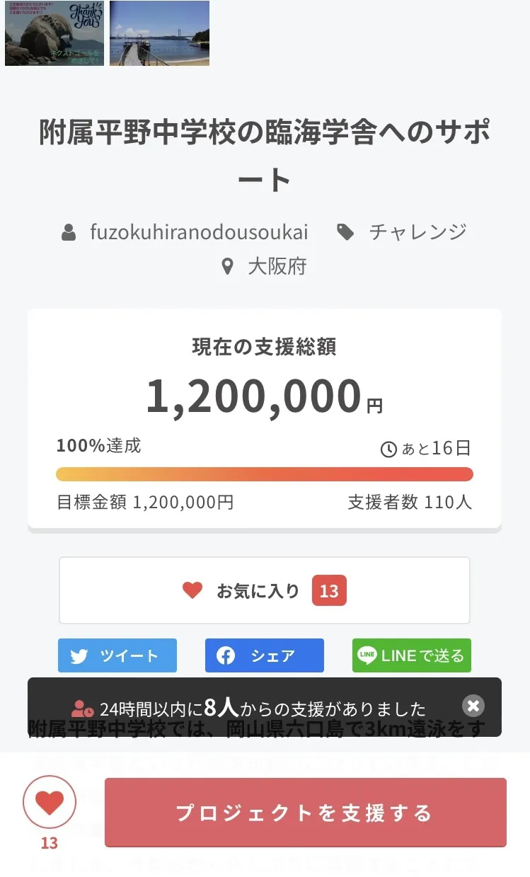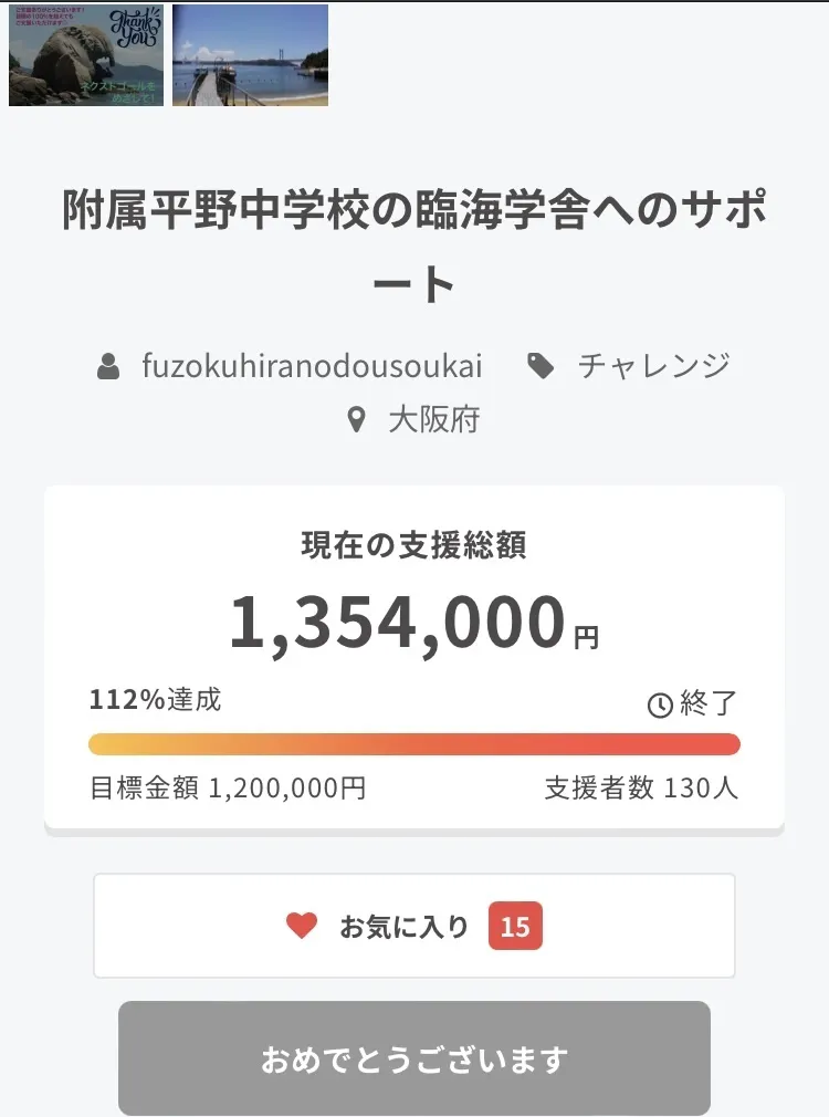 2023/06/01 11:33おかげさまで、昨日5月31日をもちまして、臨海学舎へのクラウドファンディング、100%超えで無事終了を迎えることができました。ありがとうございました!ご支援いただきました皆様には、リターン品の準備を進めさせていただきます。また、物品購入や、臨海学舎の情報も随時更新したいと思いますので、引き続きよろしくお願いいたします。 もっと見る