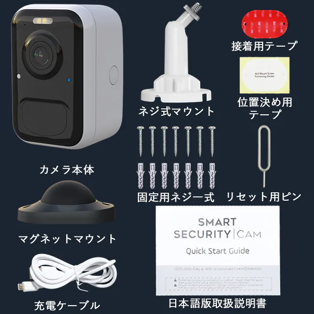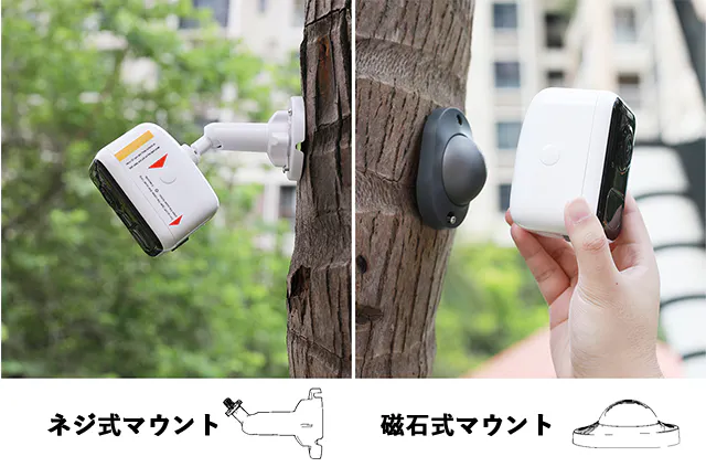 設置方法は、以下のように磁石式マウントとネジ式マウントの両方が付属していますので、どちらかお好みのマウントを付属のネジか粘着テープで天井や壁面へ設置頂いた後、マウントとカメラを連結するだけです。