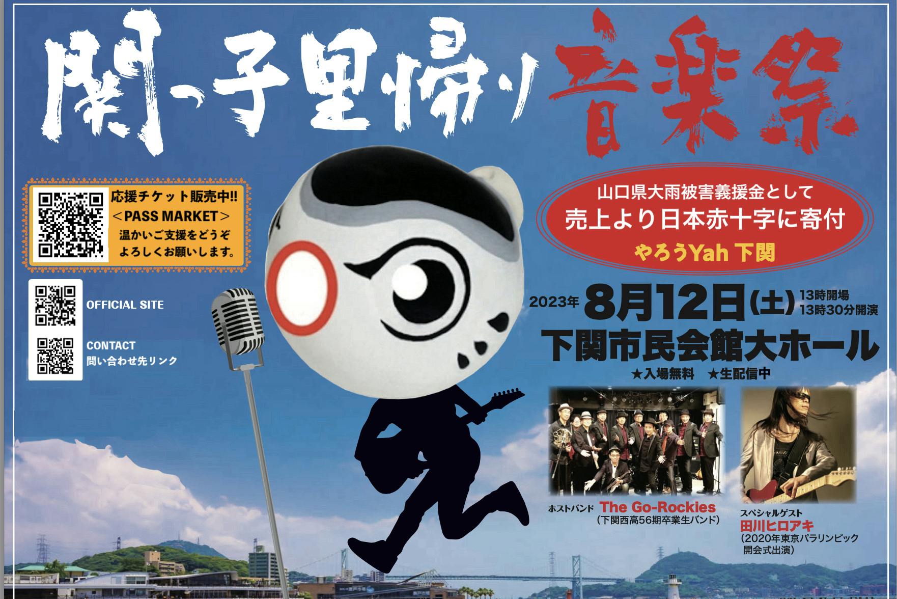 イベント内容:一般参加者から出演者を公募して選出、観客を収容した会場のステージで音楽演奏を行います。公演内容をオンライン配信 (Youtube等) で無料配信(アーカイブあり)します。コンサートは、The Go-Rockies(下関西高56期卒業生バンド)がホストバンドを務め、帰省者や地元のバンドや演奏家を紹介するとともに、スペシャルゲストの田川ヒロアキさんによる、世界を元気にする豪快なパフォーマンスをお届けします。