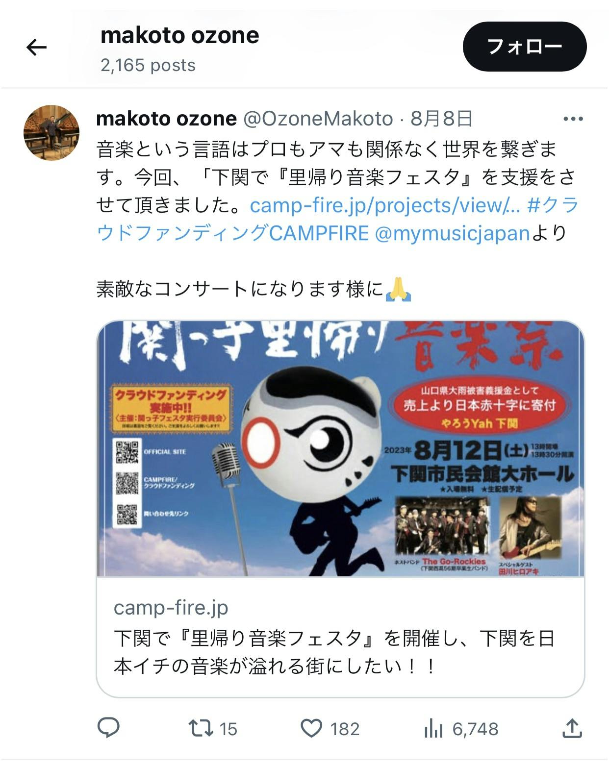 2023/08/16 13:068月12日(土)(13時〜17時)下関市民会館大ホールにて「関っ子里帰り音楽祭」が、ご支援、ご協力いただいた皆様のおかげで終了したことをご報告します。また遅くなりましたが、皆様からのご支援が目標額に達成したことのご報告と御礼を申し上げます。 結果として、その日会場で奏でられた楽曲30曲が、当日中で1600の端末で視聴され、単純計算で延べ48000曲の下関産の音源が発信されました。また多くの地元の関係者からイベントの恒例化への賛意をいただき、微力ながら地域の活性化のきっかけとなれば無上の喜びです。会計報告は改めまして9月末にオフィシャルサイトに公開します。以下当日のプログラムです。 もっと見る
