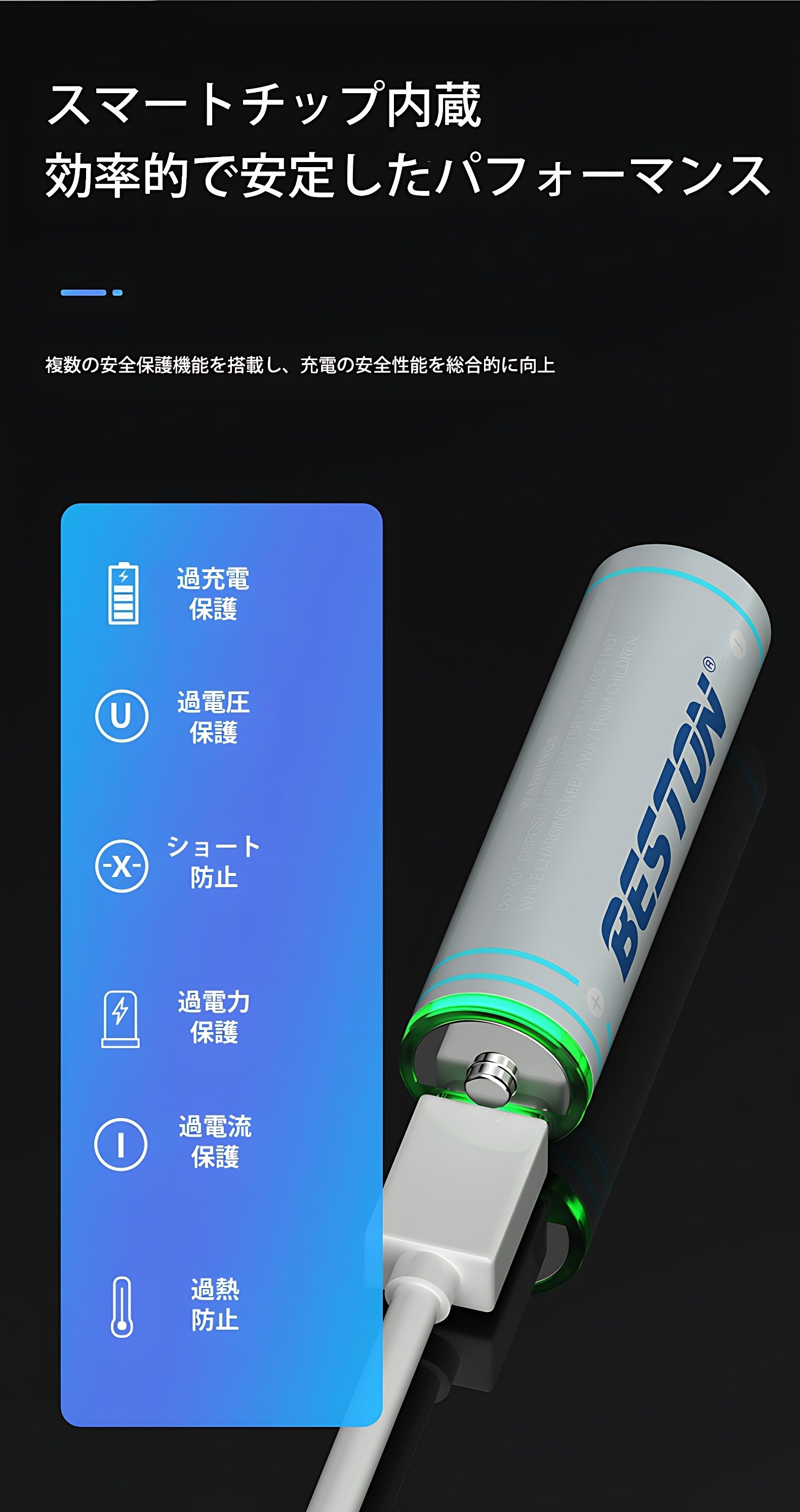 スマートチップを内蔵しており、過充電保護やショート防止機能などを搭載しているため、安心してご利用いただけます。
