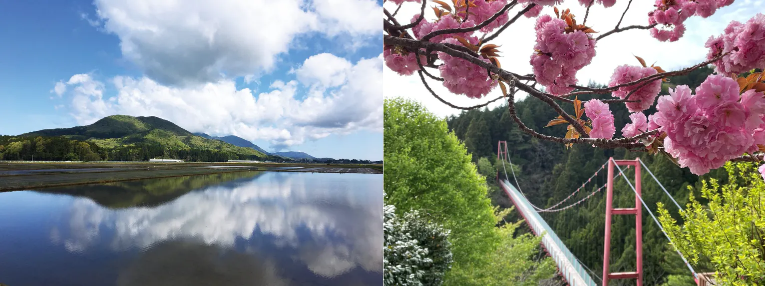 田植えの時期には湖のような湖面に国上山が移り、新緑の季節は一面が緑いっぱいに。