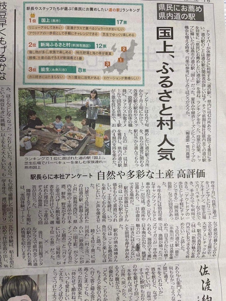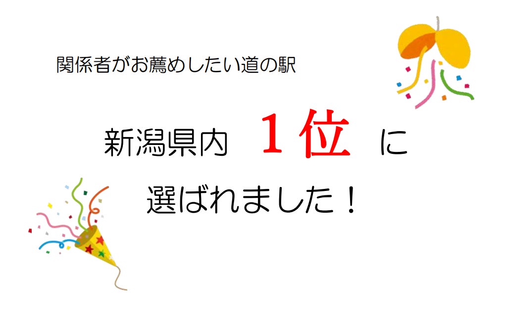 この度、新潟日報調べのアンケートの結果が出まして、新潟県内にある42か所の道の駅の中から、駅長やスタッフ、自治体職員が選ぶおススメしたい道の駅で栄えあるトップをいただくことができました。