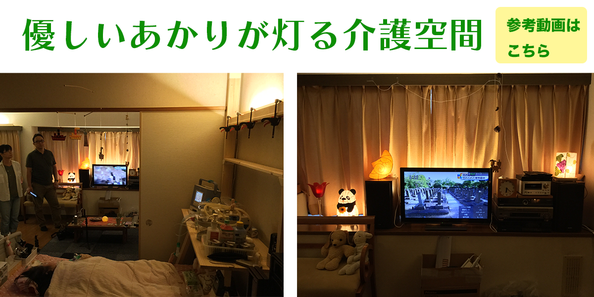でも、あかりのリノベーションをしていただき、実際に手作りのあかりを灯すと、夜間のケアも安全にできるし、以前よりやりやすくなりました。そして、手作りのあかりのもつ可愛らしさ、優しさ、温かさにほっこりして癒されます。あかりは自分で作ったものですが、今では夜になるとあかりを灯すことが当たり前となり、家族みんなが癒されています。もう元へは戻りたくないです。