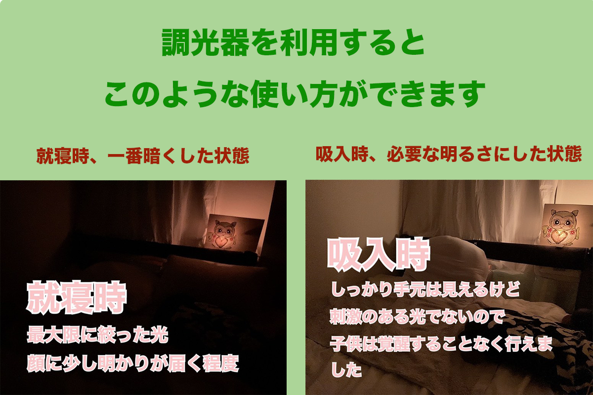 小さなお子さん(就学前)の医療的ケアをしている若いお母さんにも、明るさを変える調光器を使っていただきました。就寝時と吸入時の様子をレポートしていただいたのですが、「吸入時にもしっかり手元が見えるし、子供は覚醒しなかった」ということでした。