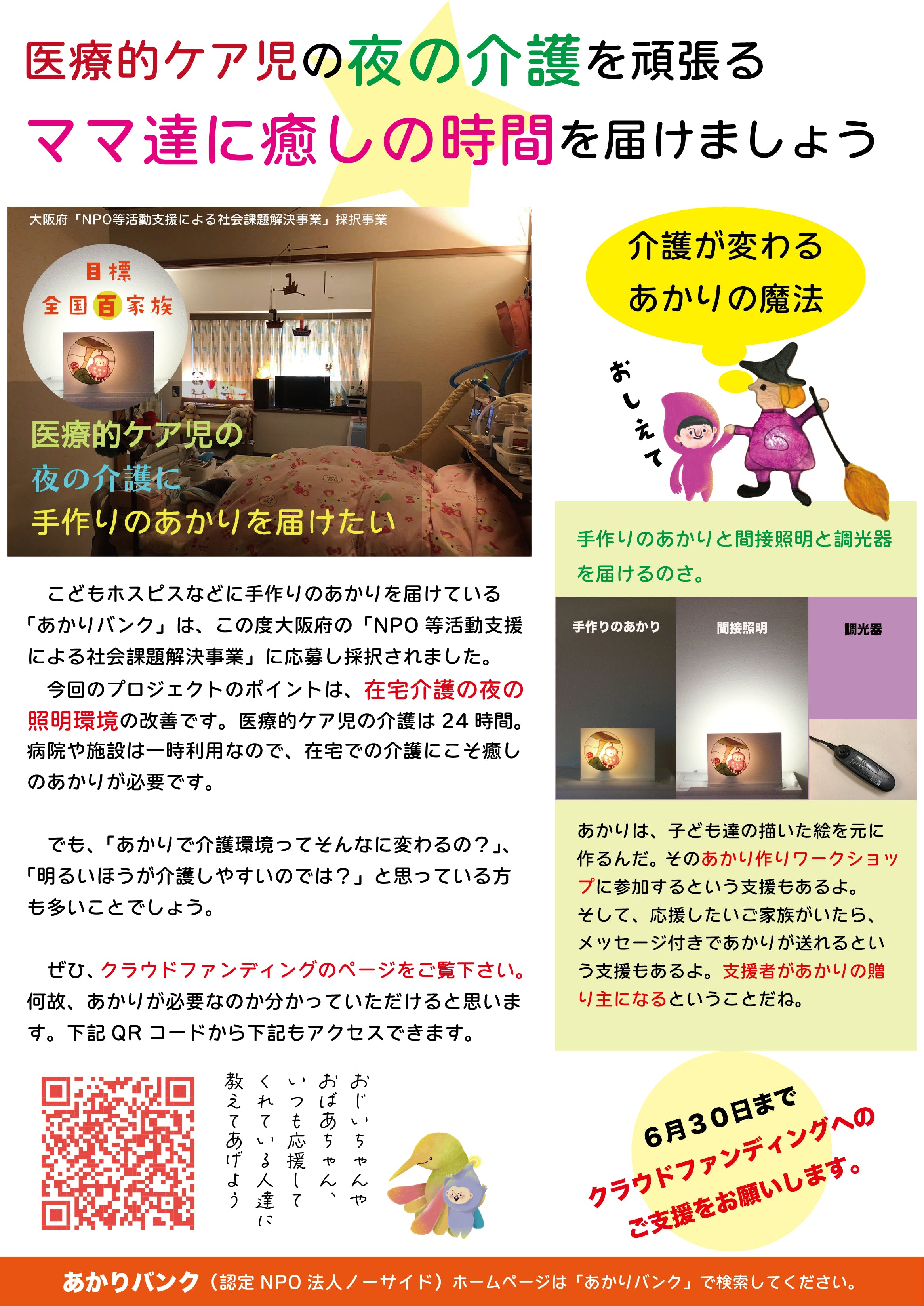 私たちは「こどもホスピス」や「病院」へ手作りのあかりを届ける「あかりバンク」という活動を続けてきました。そして、施設の利用者や、職員の皆さんから「あかりに癒されています」というお声をたくさんいただいています。しかし、この活動を通じて、病気や障害とともに生きる子ども達にとって、施設の利用は一時的であり、在宅生活の方がずっと長いという事に気付きました。つまり、お家に帰れば天井の明るい照明だけ・・というのでは、最も過酷な「夜の介護」の負担は軽減されません。今必要なのは、お家の照明環境を変えることです。
