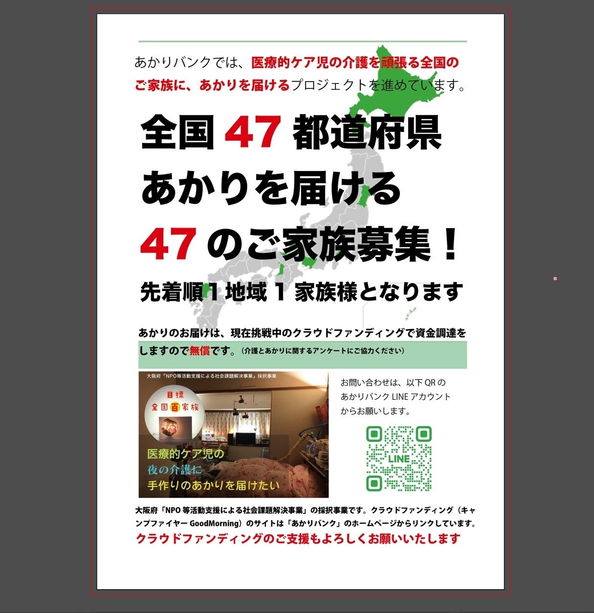 私たちは全国にあかりを届けたいと思っています。今回のプロジェクトは皆さんの支援が2倍になるという仕組みになっています。そして、もし目標達成できなくても100万円は保証されています。そこで、その資金を活用してやれることを考えました。あかりのお届けはもちろん無償です。ただし、予算の関係上1地域1家族のみとなります。既にお申し込みが来ていますので、同一地域の場合は残念ですがお届けできません。(児童発達支援事業で、医療的ケア児の介護をされている事業所の皆様、この情報をぜひ利用者さんにご案内ください)