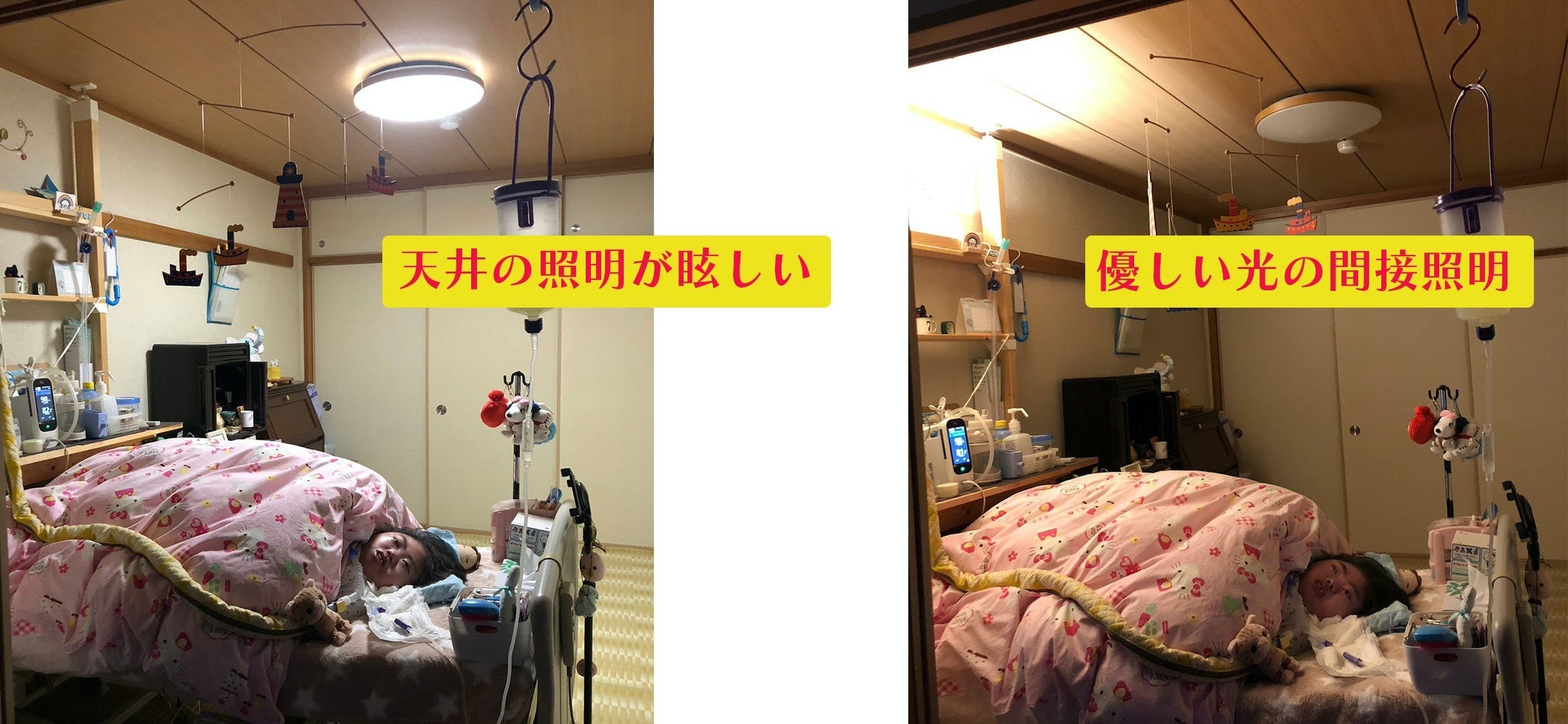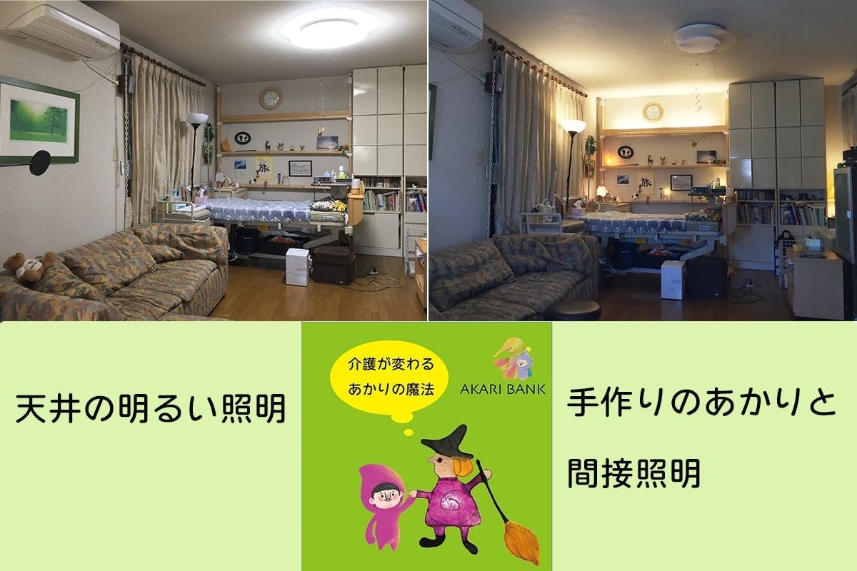 私たちが取り組んだ事例(写真上)をもう一つご紹介しましょう。こちらのお宅も医療的ケアをされています。まず、介護している部屋はリビングルームです。これはキッチンなどで家事をするお母さんにとって、いろんな処置にすぐに対応しないといけないからです。当然、そこには部屋の真ん中に大きな照明がついていました。私たちはホームセンターで材料(突っ張り棒や照明器具)を揃え、仮設(DIY)で「間接照明」を設置し、「手作りのあかり」を灯しました。(この方法は、仮設で現状復帰が容易なので、賃貸のマンション等でも実現可能です)