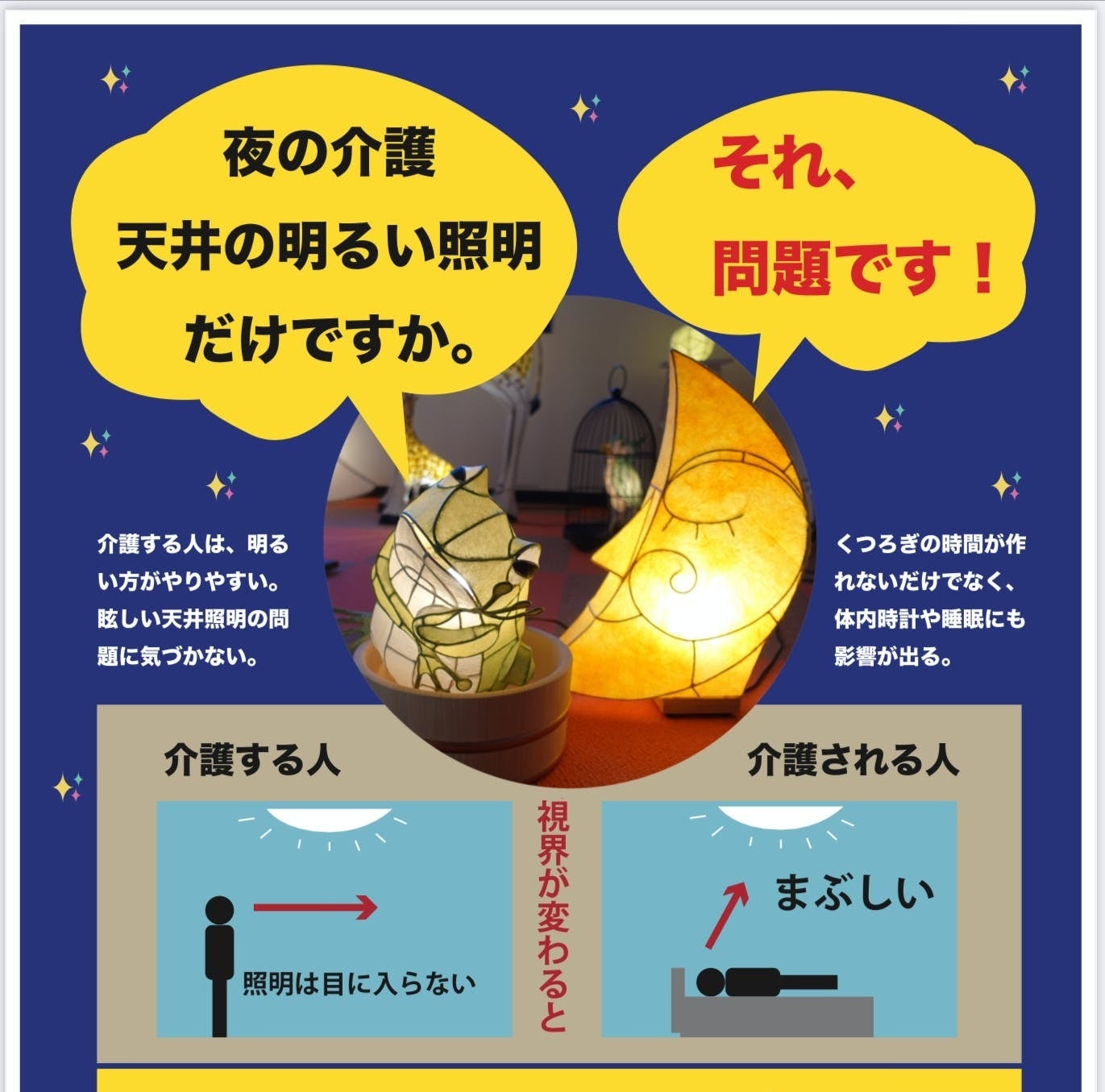 一般的に「照明は明るい方が介護しやすい」と多くの人が考えているようです。もちろん安全に介護するために、明るさは必要です。しかし、夜の介護では必要以上に明るいと、まぶしくて不快です。当然、睡眠や体内時計へも影響がでます。これは心や体の健康にとって大きな問題です。ところが、これまでなぜか問題視されることはありませんでした。