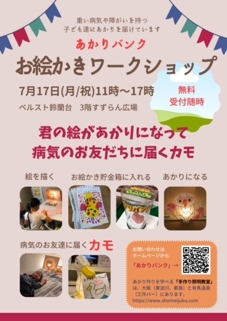NPO法人ノーサイド「あかりバンク」の西谷です.手作りのあかりを届けるプロジェクトを応援いただいた皆様,誠にありがとうございます.7月17日(月)11時~17時に神戸鈴蘭台ベルスト3階すずらん広場にて,あかりのデザインのもとになる子供たちの絵をあつめるワークショップを開催します.子ども達の描く絵は,大人の発想では思いつかない,可愛くてユニークなものがたくさんあります.どんな絵が集まるか楽しみです.少しだけですが,あかりの展示もあります.お近くの方はぜひお越しください.