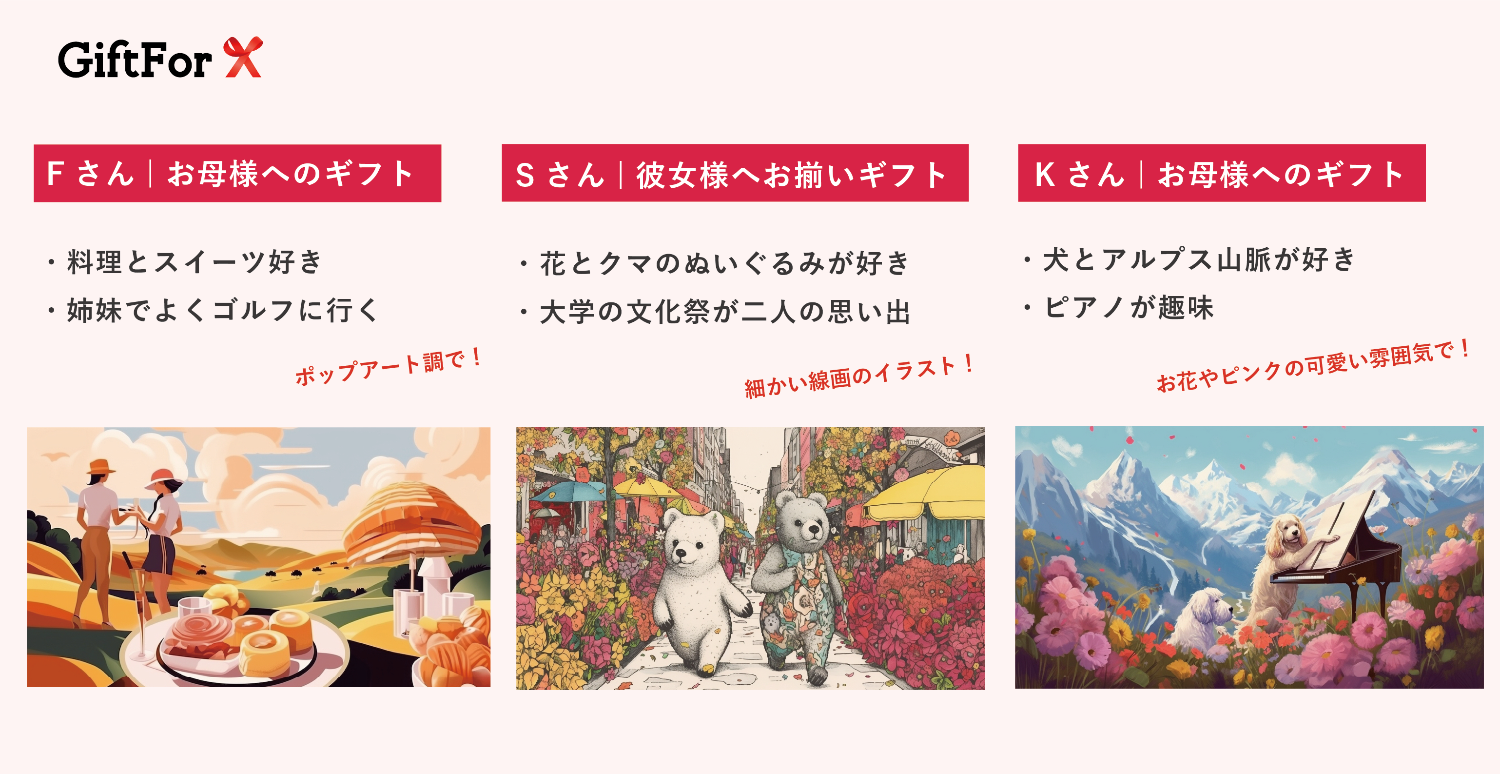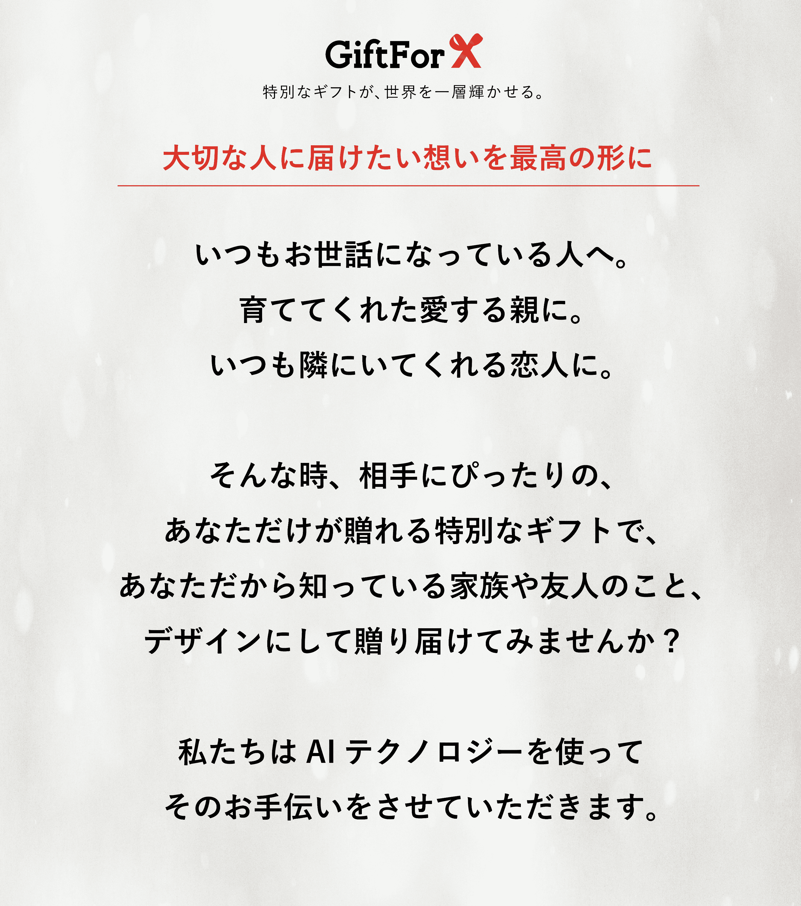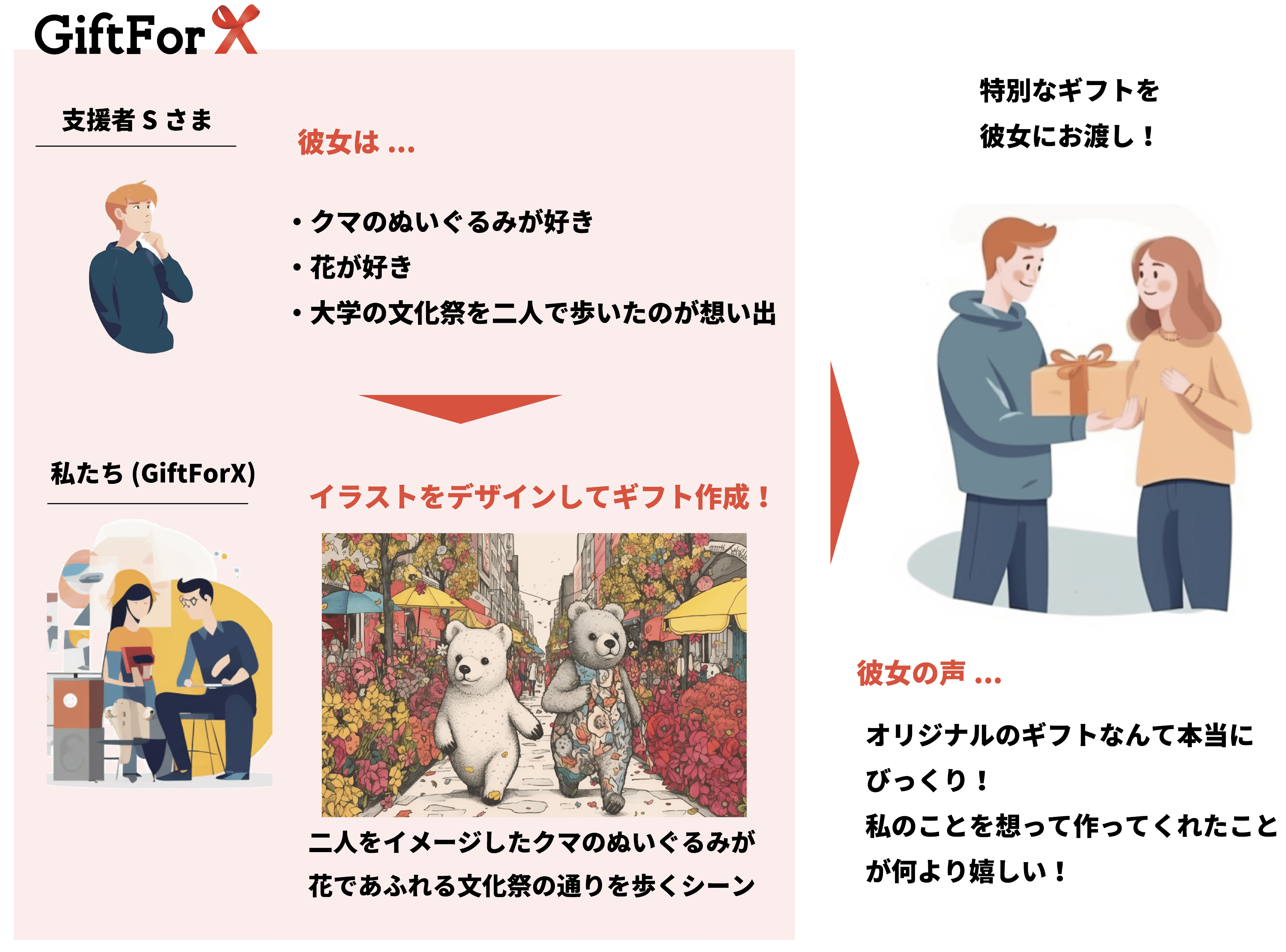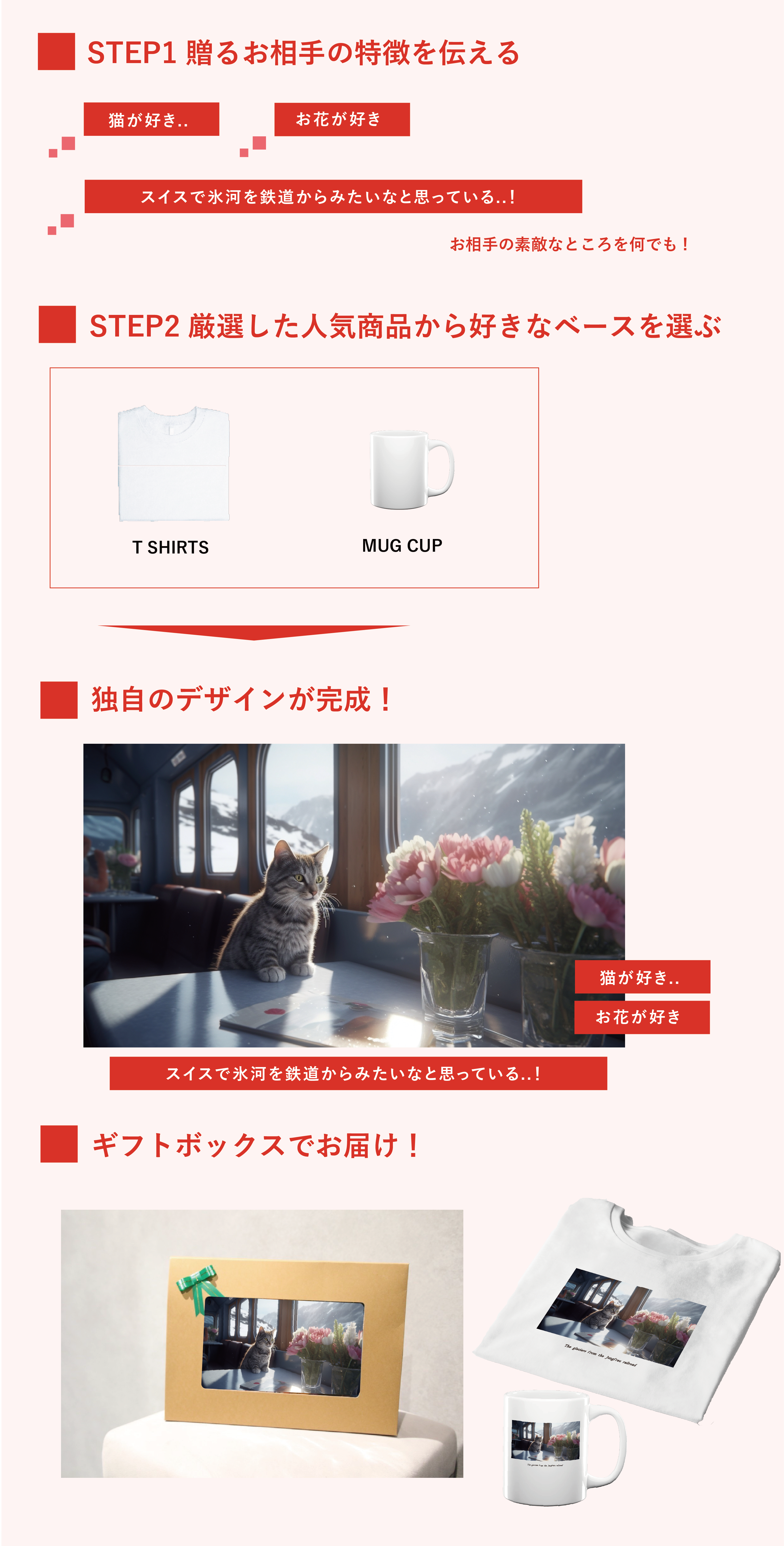 私たちは、ギフトを贈りたいお相手の好きなものや思い出など一人ひとりのストーリーに寄り添ったデザインを作成し、ギフトとしてお届けします。あなたの思いから生まれたギフトで、ステキなサプライズを。もちろん、自分へのご褒美としても。
