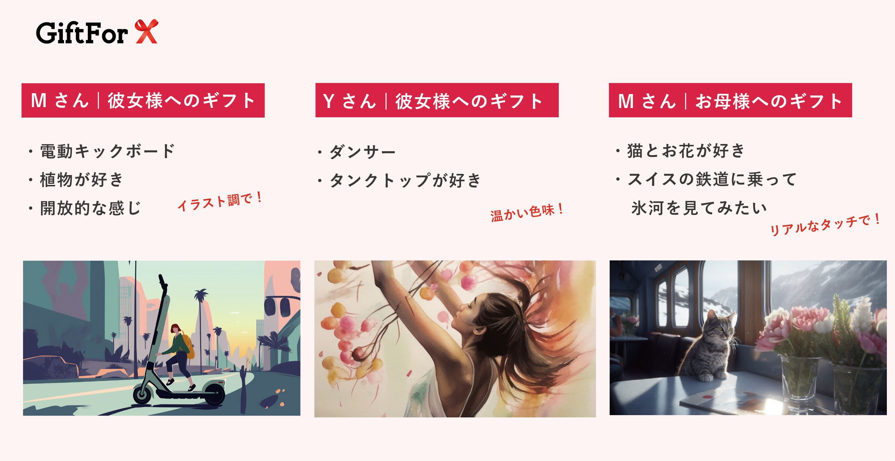 A. 上記のデザイン生成例をご参照ください。完成形がイメージできていなくて全く構いませんので、相手の好きなものや、思い出の場所など、できる限りの情報を頂けると幸いです。情報は多ければ多いほど、デザインの可能性は広がります。必ず入れたい要素や、絵のタッチの指定(イラストレーション調、水彩画風、写実的に、など)があればその旨ご記載ください。