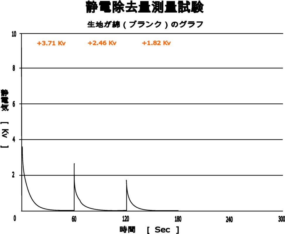 試験の結果、①『綿(ブランク)』では帯電後に徐々に電圧が下がっていくのに対し、②『ソルファイバー』の方は、計測し始めから帯電していないことがわかります。 したがって、実験によって『ソルファイバー』の静電除去性能が確認できました。