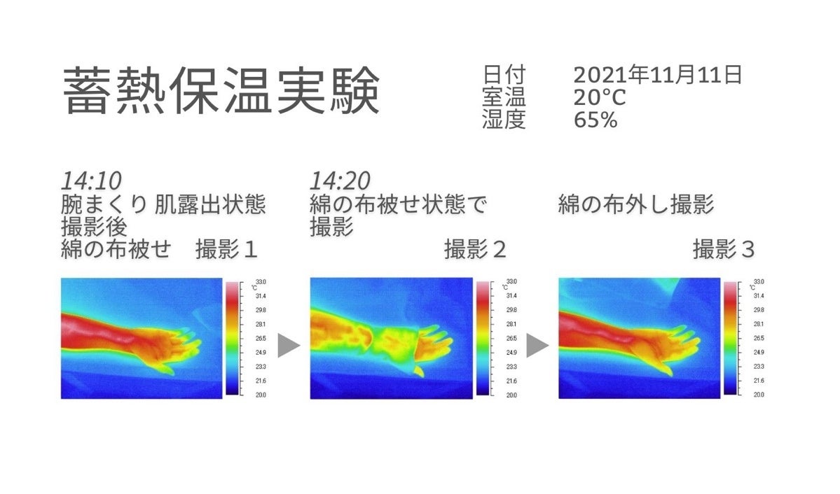 綿(ブランク)と『ソルファイバー』で露出した腕にそれぞれの生地を被せ体温の温度変化を見ました。