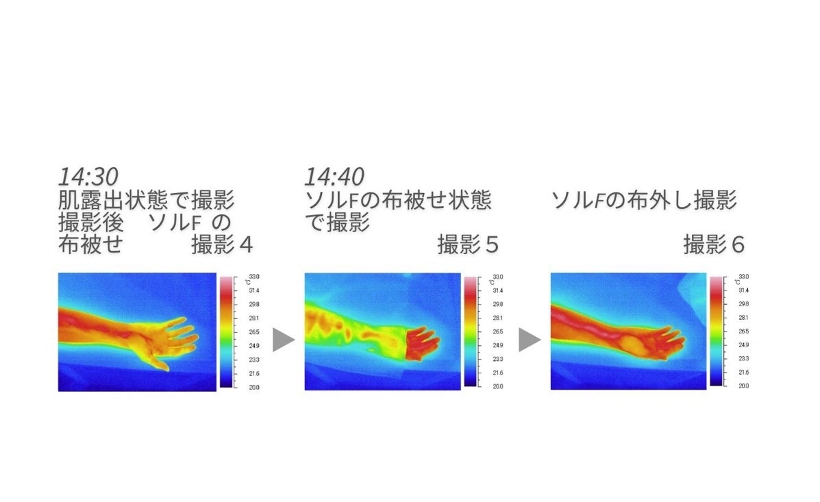-検査地 富山県 -試験実施時期 2021年11月11日 -試験結果 肌露出状態からブランクの布を被せその後ブランク布を外した状態を撮影した撮影3と肌露出状態から『ソルファイバー』の布を被せその後ブランク布を外した状態を撮影した撮影6を比べると指先の体温が上がり、血流量の増加が確認できました。