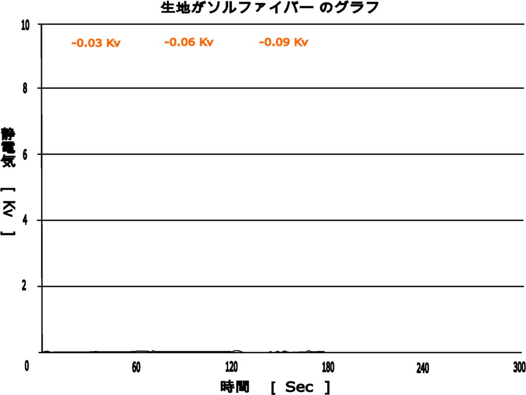 試験の結果、①『綿(ブランク)』では帯電後に徐々に電圧が下がっていくのに対し、②『ソルファイバー』の方は、計測し始めから帯電していないことがわかります。 したがって、実験によって『ソルファイバー』の静電除去性能が確認できました。