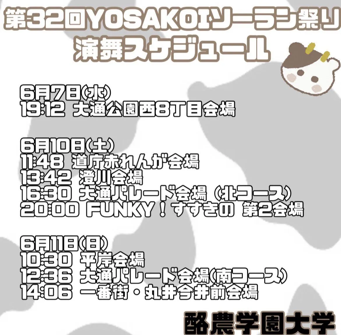 2023/06/06 23:18いよいよ本祭が始まります…!!酪農学園YOSAKOIソーラン“祭”の演舞スケジュールをお知らせします。お時間合えばぜひ演舞を見ていただけると幸いです。 もっと見る