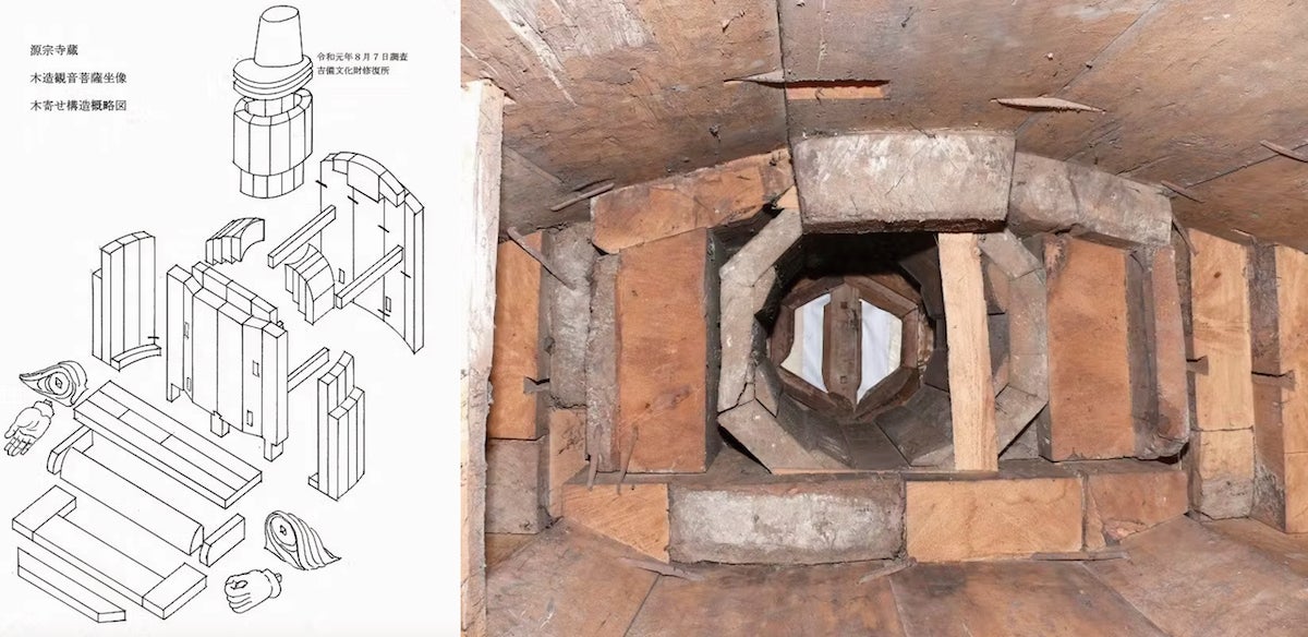 観音菩薩像の木寄せ構造概略図(左)と内部の状態(右)(吉備文化財修復所提供)