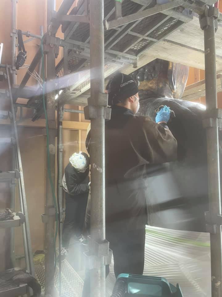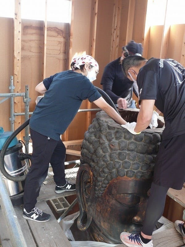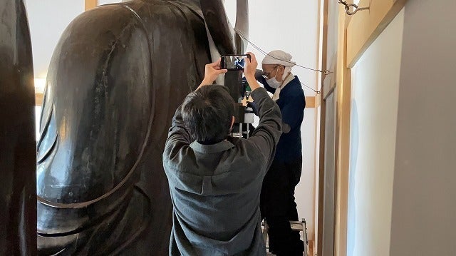 そこで、埼玉県内含め各地の仏像修復をおこなっており、また今回の大仏の移動作業や第1期の修復も手掛けた「吉備文化財修復所」(代表:牧野隆夫氏)に、修復処置をお願いします。