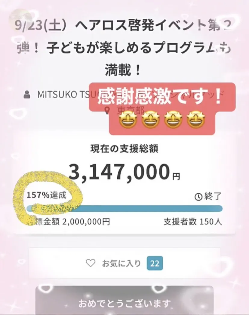 SNSを通じてご支援くださった方、お会いした際にご支援したくださった方、イベントチラシを見てQRを読み込んでくださった方・・・・150人もの方々にご支援いただけましたこと、スタッフ一同心から感謝申し上げます。ヘアロスの認知がもっとポップでいい。イベントに参加して後付けて症状の事を知るでいい。人との違いは、その人を構成する要素のたった1つでしかない。そんな風に私達当事者が思えたら、社会の認知も変わって行ったら、そこにはきっと今とは違う景色があるはず。ご支援ただきました皆さま、ありがとうございます!!