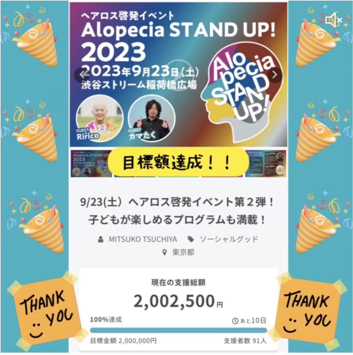 たくさんの方からご賛同いただき、最初の目標額200万円に到達することができました!!本当に本当にありがとうございます!!パレードは誰でも参加できますので、ぜひ当日は私達と一緒に盛り上がりましょう!【参加者専用グループは近日お知らせします】今回のイベントに際して、スタッフを募り、全国から有志が集まりました!!関東だけではなく、関西や九州など遠くから参加しています。いつもオンラインでミーティングを行い、作業分担して準備を整えています。そんなスタッフのみんなと会場で集合出来るよう、さらにネクストゴールに向けて挑戦したいと思います‼クラウドファンディング終了まであと10日!引き続きご支援よろしくお願いいたします!また、もっとたくさんの方にヘアロスのこと、今回のイベントのことを知っていただきたい!ぜひ拡散していただけるとうれしいです。最後まで走り抜けます!よろしくお願いいたします!!