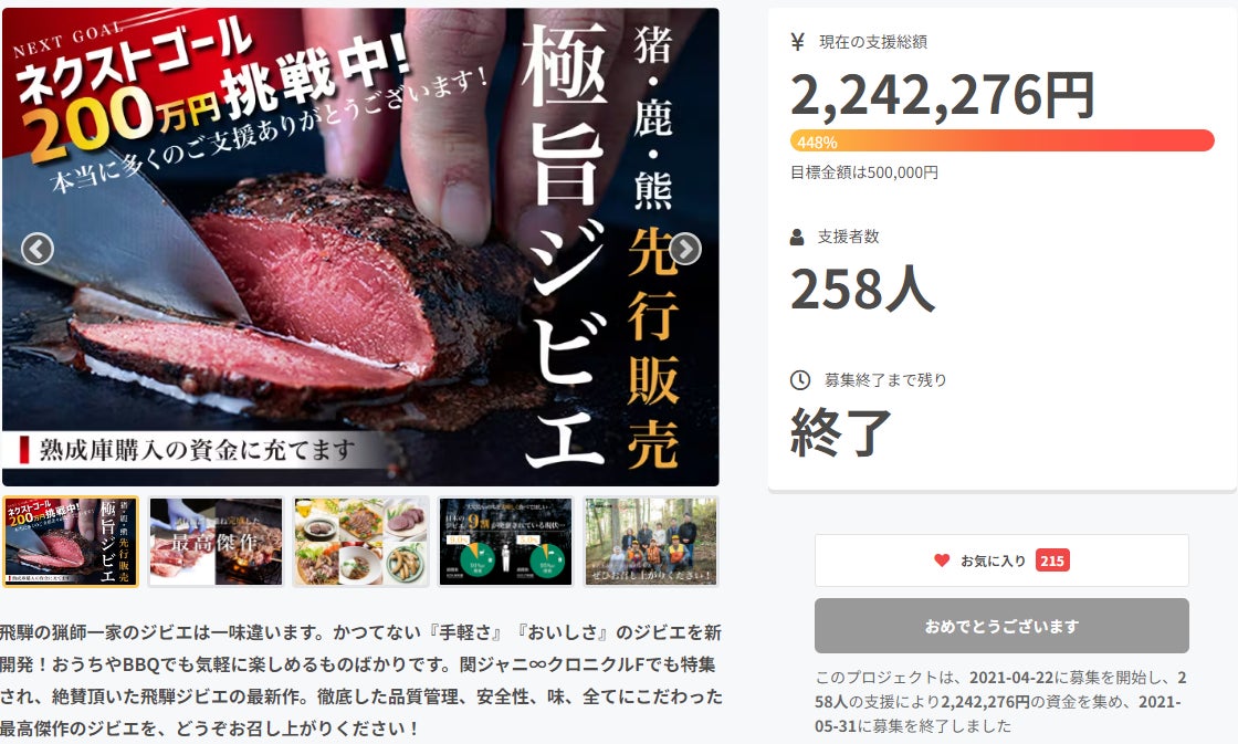 飛騨ジビエプロジェクトへのご支援ありがとうございました!