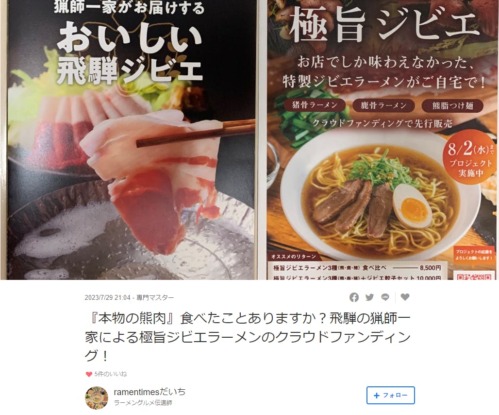 2023/08/01 19:00皆様にお届けするジビエラーメンをちらっとご紹介♪飛騨狩人工房の脇谷です。7月より皆様に応援いただきました、こちらのクラウドファンディングも8月2日で終了となります。皆様に美味しさを分かりやすく届けるために、ラーメングルメ伝道師「ramentimes だいち」さんに、熊脂つけ麺をお召し上がりいただき、レビューをいただきました。ぜひジビエラーメンをお選びいただいた方は、こちらのレビューもご覧に頂きながら、楽しみにお待ちください!▶『本物の熊肉』食べたことありますか?飛騨の猟師一家による極旨ジビエラーメンのクラウドファンディング!(熊チャーシューという記載がありますが、正しくは猪チャーシューです。)プロジェクト終了後にリターンの製造開始と発送も行ってまいります。改めて発送についてはご連絡させていただきます。私たちの想い、ジビエラーメンをより多くの人にお届けしたいと思っておりますので、プロジェクトの拡散にご協力いただけましたら嬉しいです!最後までよろしくお願いいたします。プロジェクトページはこちら! もっと見る