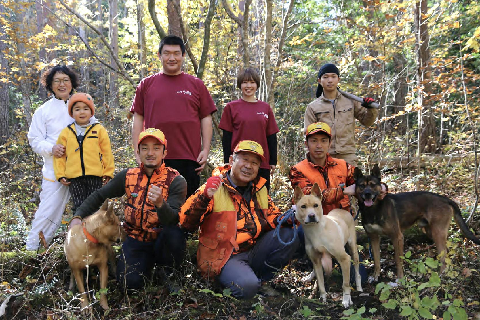 父の影響で猟師になり、一家で狩猟、解体、加工、販売、飲食店の運営を一貫して行っております。私と三男は日々狩猟や精肉を行い、美味しいジビエ肉が提供できるように取り組んでいます。次男は大阪で料理人として修業後私たちと合流し、皆様にジビエを美味しくお召し上がりいただくため、メニュー開発や料理の研究をしています。