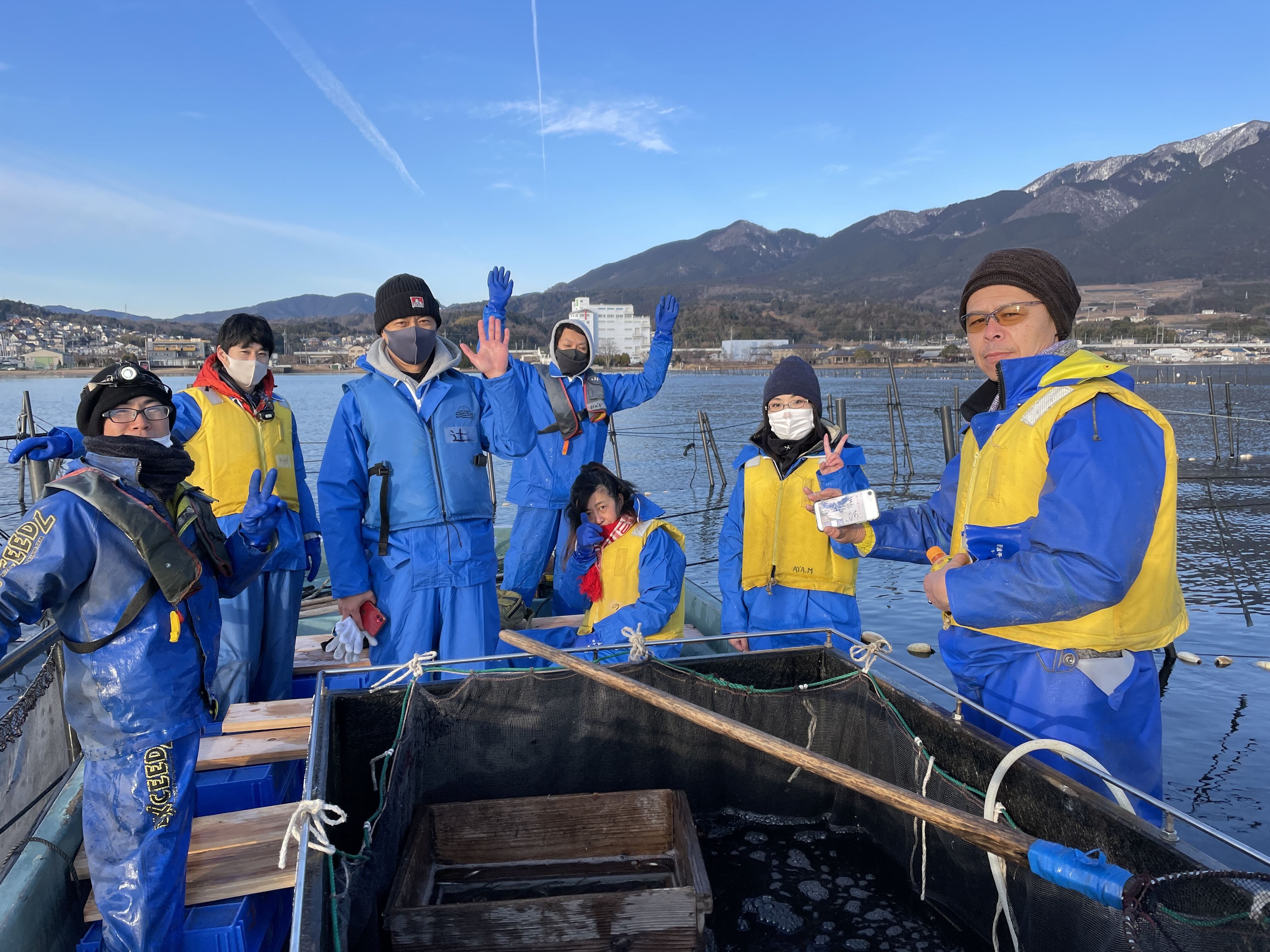漁業体験の様子。比良山も冠雪する寒い中で。