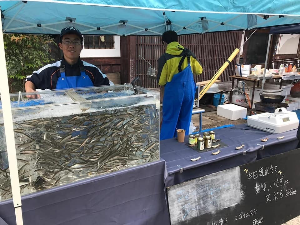 滋賀県下のマルシェなど、生産者直売のチャンスには、その日の朝に魞(エリ)でとれた魚を活かしたまま展示・販売!