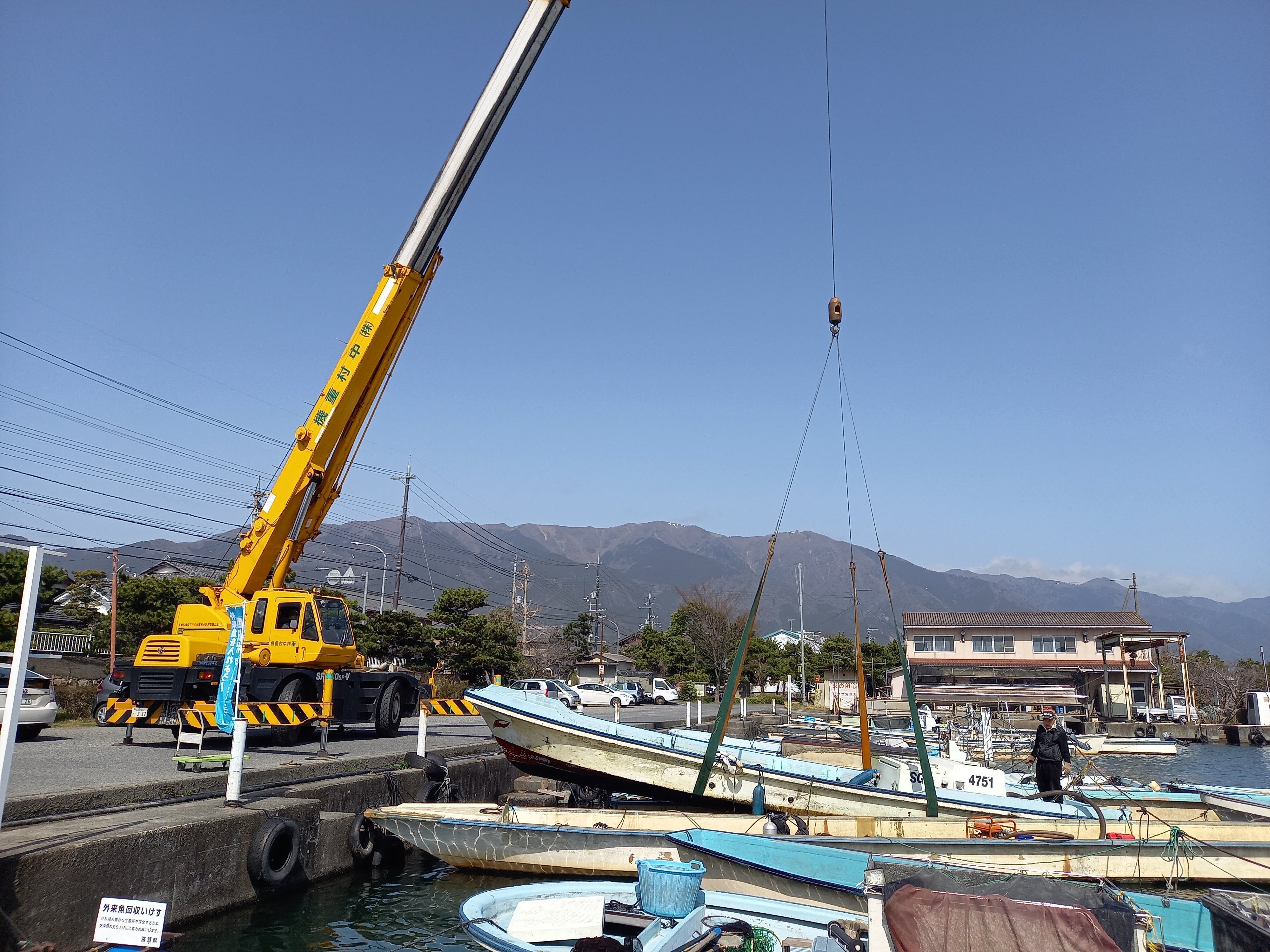雄大な比良山を望む和邇漁港の写真ですが…こちらも船が水没してしまって引き上げている様子です。船の修理、引き上げ費用など、出費はかさむばかり…