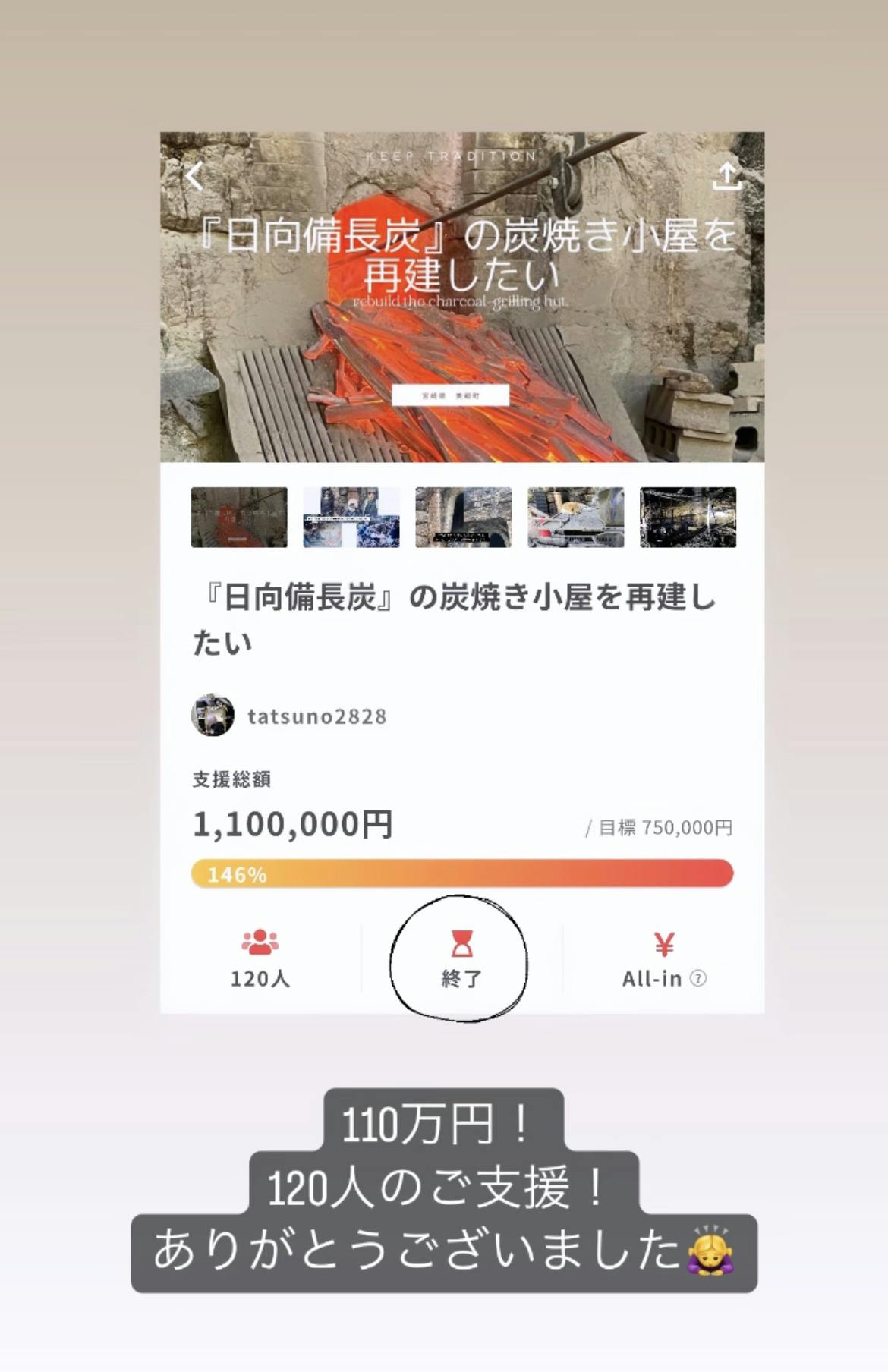 2023/06/15 09:00ご報告が遅くなって申し訳ありません。ほっと一息ついたところで、田植えで全体力を消耗しておりました。無事に26日間のクラウドファンディングを終えることができました。ネクストゴールに届くことはできませんでしたが、120人の支援者の方から、11,000,000円のご支援をいただきました。家族に相談もせず、1人で立ち上げたプロジェクトでしたので不安でしたが、チャレンジして良かったです。こんなにたくさんのご支援と暖かいメッセージをいただけたのは、皆さまのおかげです。本当に本当にありがとうございました。最終日のインスタライブ見ていただけたでしょうか。地元の方も来てくださり、賑やかな夜でした。女性の生炭者2名を迎えての配信でした。1人は“ぽつんと一軒家”にも出演された日髙さん。もう1人は、地域おこし協力隊で東京から移住された松岡さん。他の地域で炭焼きをされている方のお話が聞けたり、地元ならではの話題で盛り上がったり、お二人とも終始素敵な笑顔で配信してくれました。その他にも、美郷町移住担当の川西さん、炭焼きレジェンドの血を引く梅田さんなどなど…地元の人で知らない人はいないメンバーに出演していただきました。ライブ配信した場所は美郷町北郷入下にある「〇〇処ななし庵」さんです。昭和初期に建てられたという3階建ての古民家を改装されています。メニューも豊富でどれも美味しかったです(^^)美郷町外から来てくれた友人は、暖かい人たちと暖かい空間に感動していました(^^)小屋の再建は8月から始まる予定です。ここからがスタート。暑さに負けずに頑張りたいと思います。最後に、リターン品目の“メッセージ”は、リターン品の発送連絡と共にお送りします。おひとりおひとりにお手紙を書く気持ちでメッセージを考えるのも楽しい時間です。それでは次回もお楽しみに! もっと見る