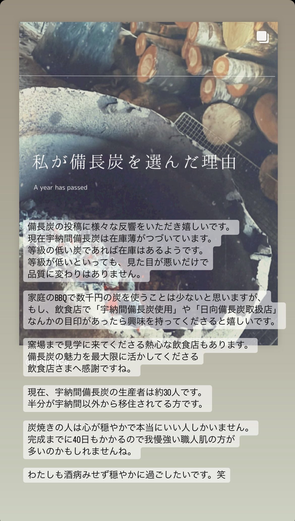 まずは炭焼きを後世に残すことで、皆さまへの恩返しをさせていただきたいと考えています。