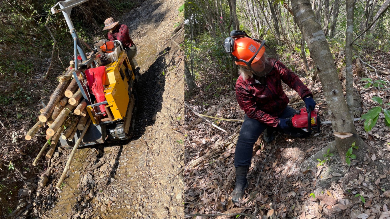 硬くて重いアラカシは伐採も一苦労、倒した木は2m程に玉切りし、重機を使って運び出します。
