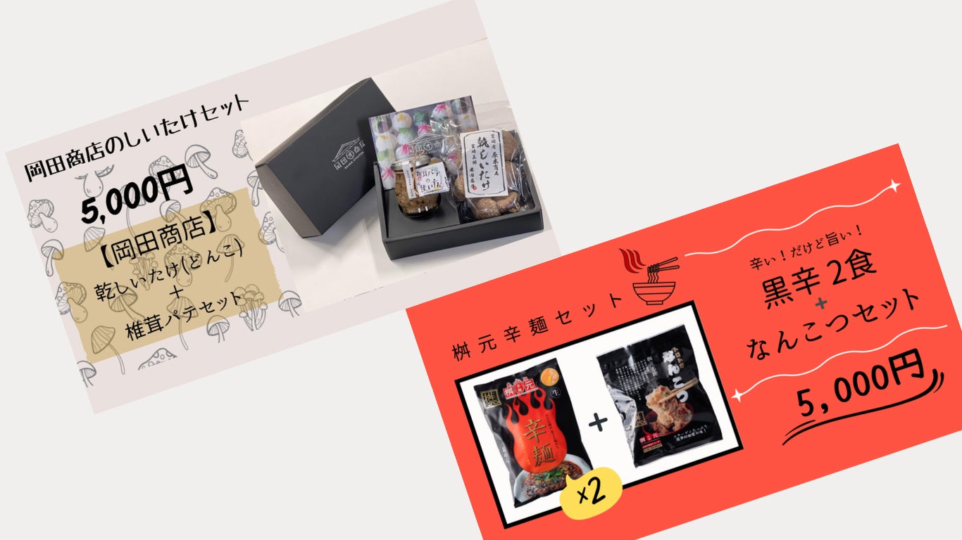 岡田商店さまご提供の「しいたけセット」、辛麺屋桝元さまご提供の「桝元辛麺セット」は7月の発送を予定しております。