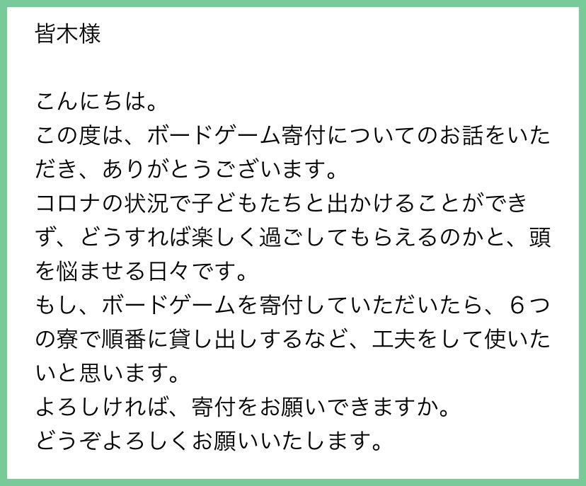 私は児童養護施設とは特に繋がりもなく、関係者がいたわけでもなかったので、受け取りの可否の確認も含め、全国の児童養護施設へメールを送らせていただきました。