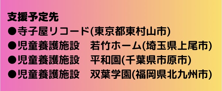 ※スケジュールにつきましては前述の通りですが、100%達成の場合には下記の支援予定先へ各2セットずつ支援させていただきます。