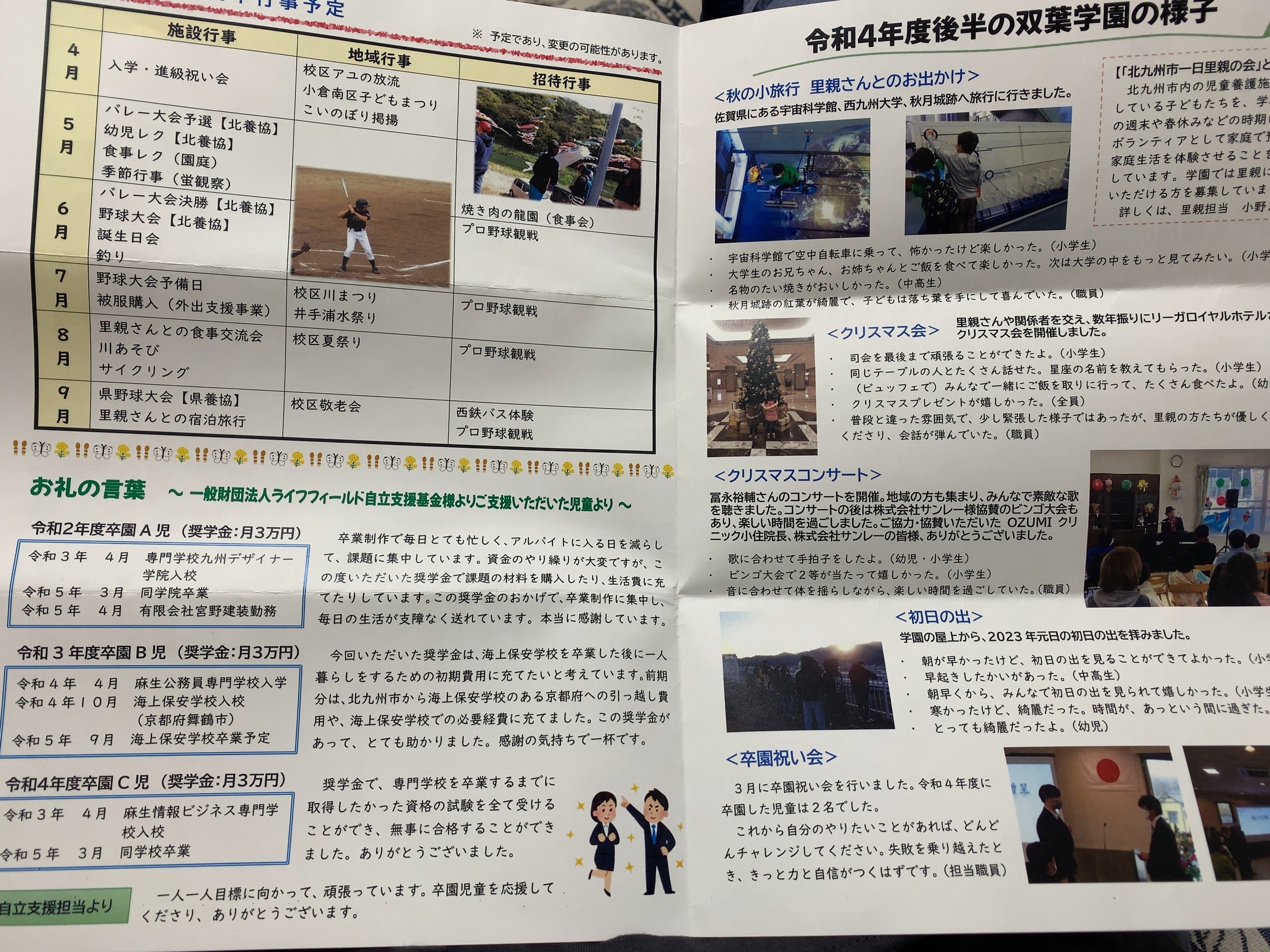 2023/06/15 22:56以前から寄付をしている双葉学園から広報紙が届きました!3ヶ月に一度届きますが、お出かけや招待行事も増えてきているようです。専門学校を卒業したり、資格を取ったり就職が決まった子もいるようです。そして様々な企業、個人から寄付が届いていますね。私もこれからも様々な形で支援を続けていければ良いなと思っています! もっと見る