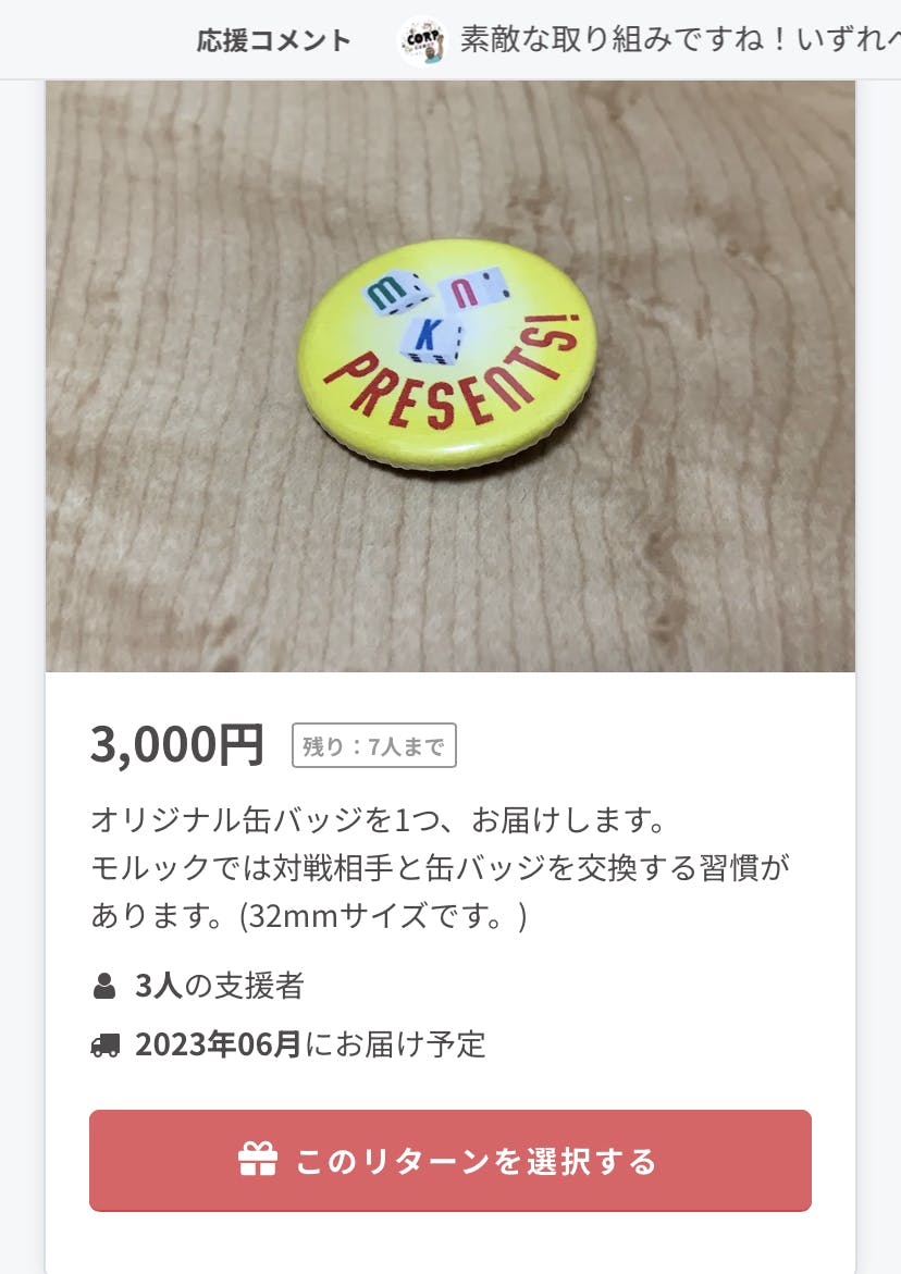 3,000円のリターンでオリジナルバッジがあるのですが、少しずつこちらを選んでいただけるようになりました!
