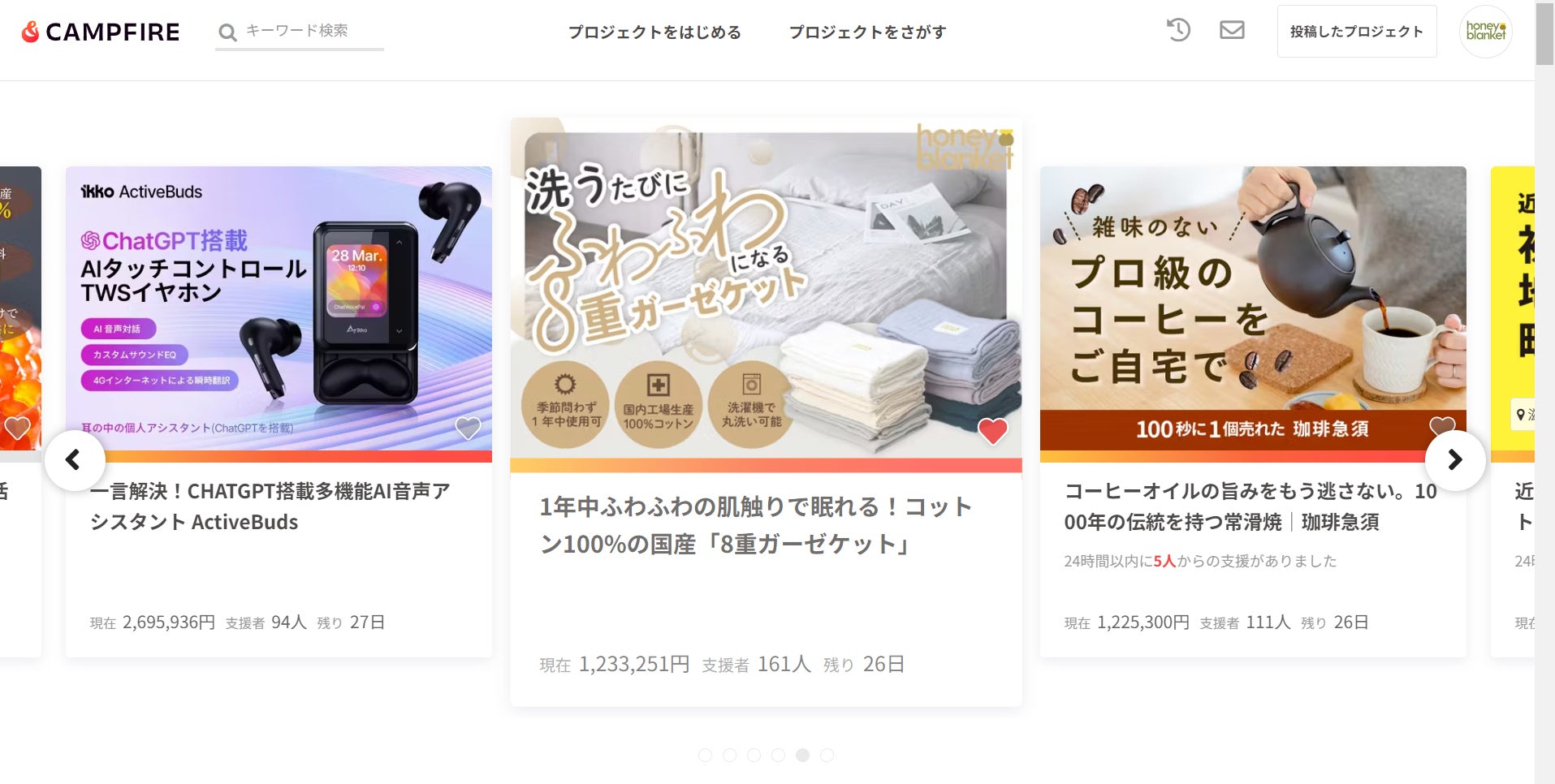 CAMPFIREのトップページに8重ガーゼケット掲載中!!!