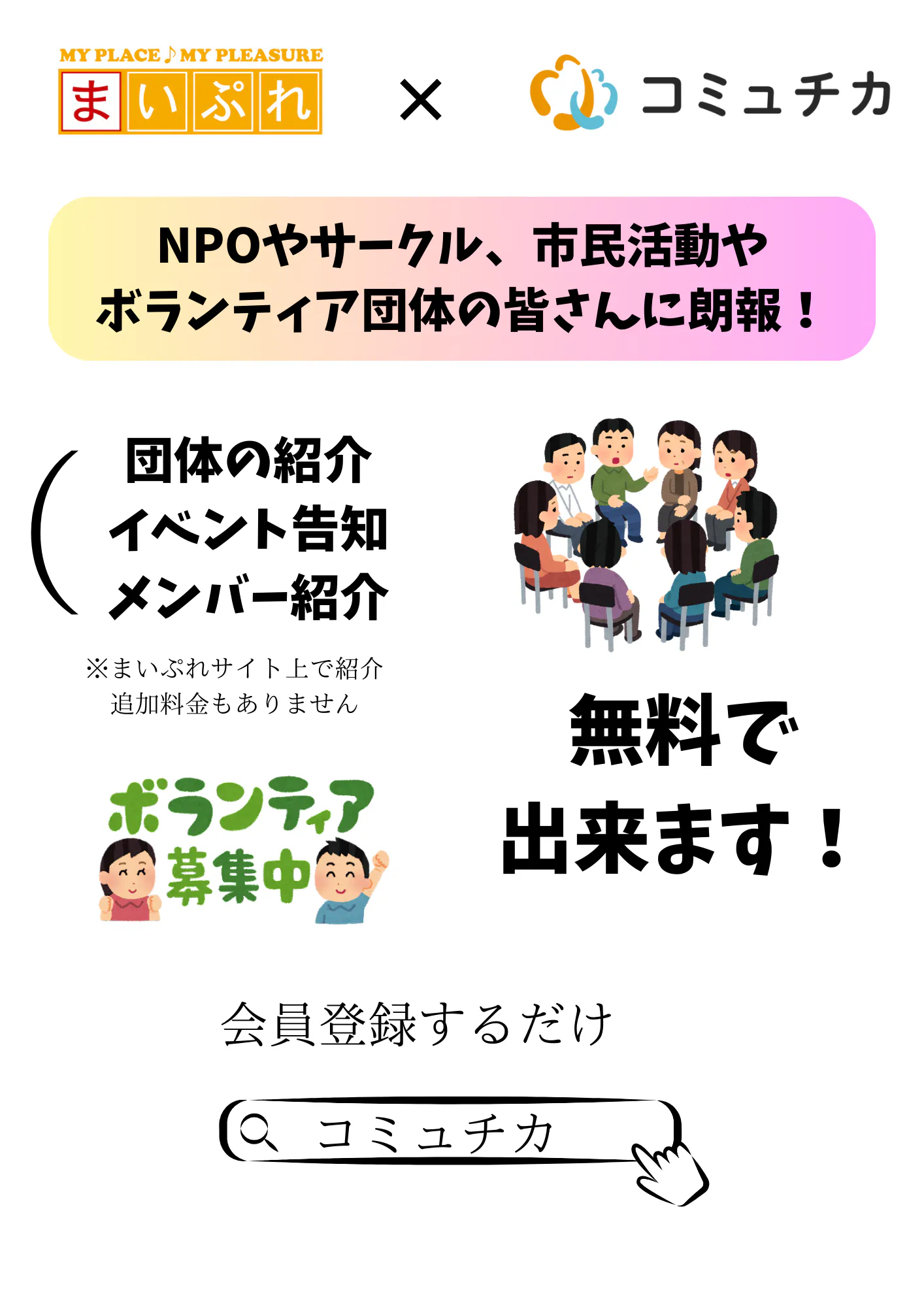 登録さえすれば団体の紹介、イベント告知、メンバー募集が無料で行うことができます。