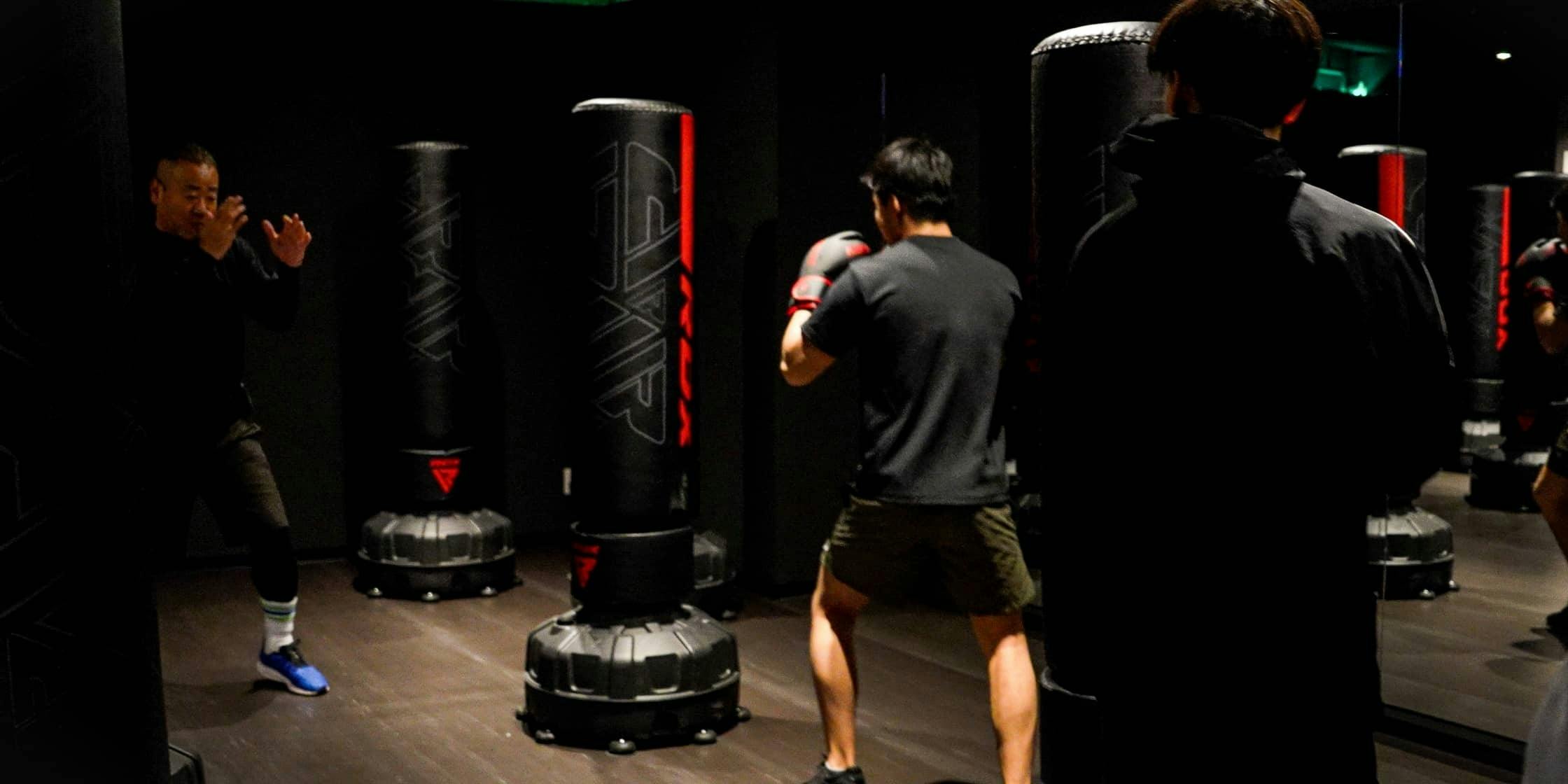 大音量のテンポの良いクラブ音楽が流れる中、30分間の体験がスタート。トレーナーの動きを真似しながらサンドバッグを打っていきます。「難しくないし楽しい!手軽にできるやん!」