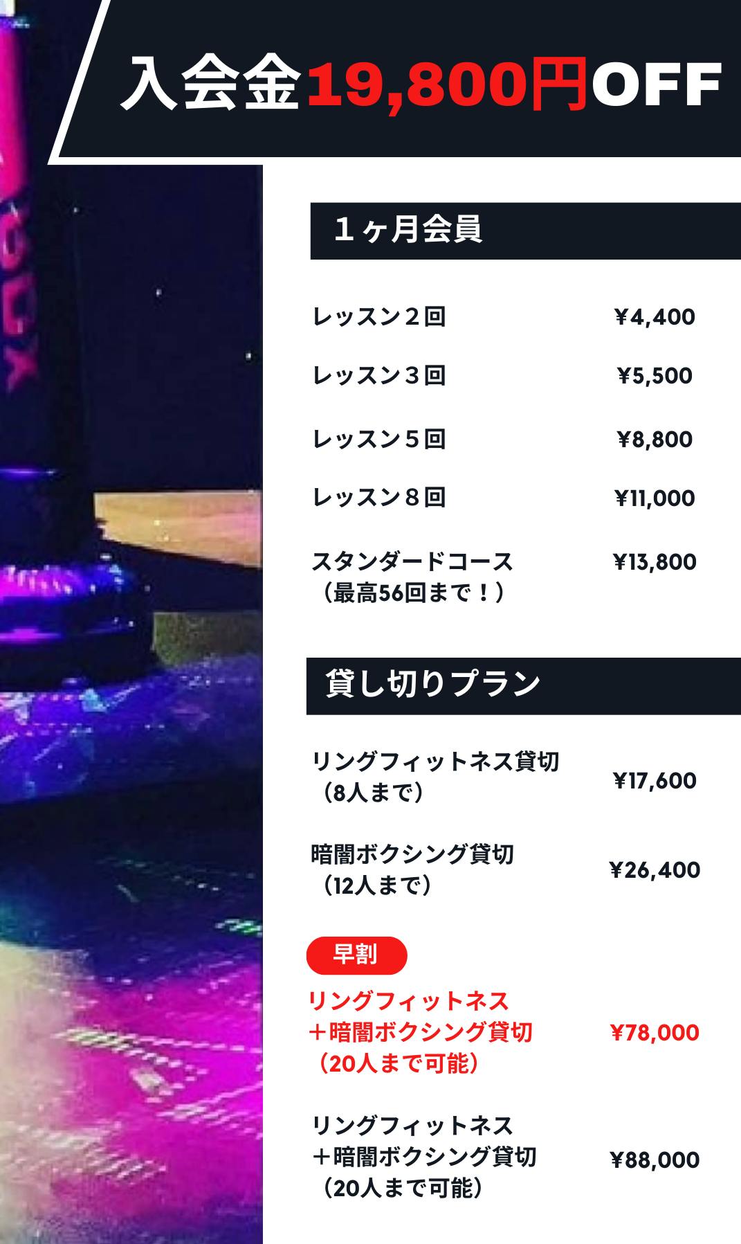 生活スタイルにあわせて、月2回コースから8回コースまでご用意しました。週2以上通われる方は【スタンダードコース】1日で2回(暗闇ダンスボクシングとリングフィットネスの両方)受講できるコースが断然お得です!!