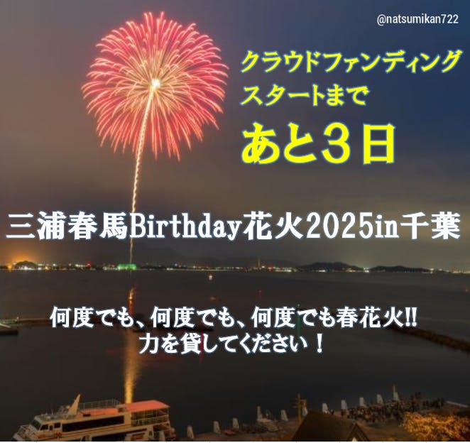2024/07/26 05:06三浦春馬Birthday花火を応援いただき、ありがとうございます。2025in千葉のためのクラウドファンディングは、7月29日スタートです。現在プロジェクトページをプレビューにて公開中です。お時間のある時にでもちらりと覗いていただけると嬉しいです。さて、本日は「三浦春馬Birthday花火2025in千葉」にご支援いただくためのURLをお知らせいたします。プレビュー用のリンクからでは、クラウドファンディングスタート後でも実際にご支援いただくことはできません。ご支援を賜れるリンクは以下のとおりです。三浦春馬Birthday花火2025in千葉へのご支援はこちらからhttps://readyfor.jp/projects/miuraharumabirthdayhanabi?sns_share_token=cae97aed9371be0622b3クラウドファンディングスタートまであと3日となり、不安も緊張もMAXですが、春花FRIENDSの皆様の「みんなついてるから大丈夫!」というメッセージもたくさんいただき、本当に今から泣きそうなくらい感動しております。どうしても一人で全てを背負いたがる悪い癖がある私に、もっとみんなを信じていいんだと教えてくださり、ありがとうございました。2025も先頭に立たせていただきます。ですから、「プロジェクトにおける全ての責任は、私が負う」に何ひとつ変わりはございません。ですが、至らぬ私を支え、時に力強く引っ張ってくださる“春花FRIENDS”の皆様と共に3度目のクラウドファンディングに挑めること、光栄に思います。「三浦春馬Birthday花火2025in千葉」の支援はこちらのリンクを利用します↓https://readyfor.jp/projects/miuraharumabirthdayhanabi?sns_share_token=cae97aed9371be0622b3拡散希望!ご友人、身近な方へお声がけにご協力をお願いいたします! もっと見る