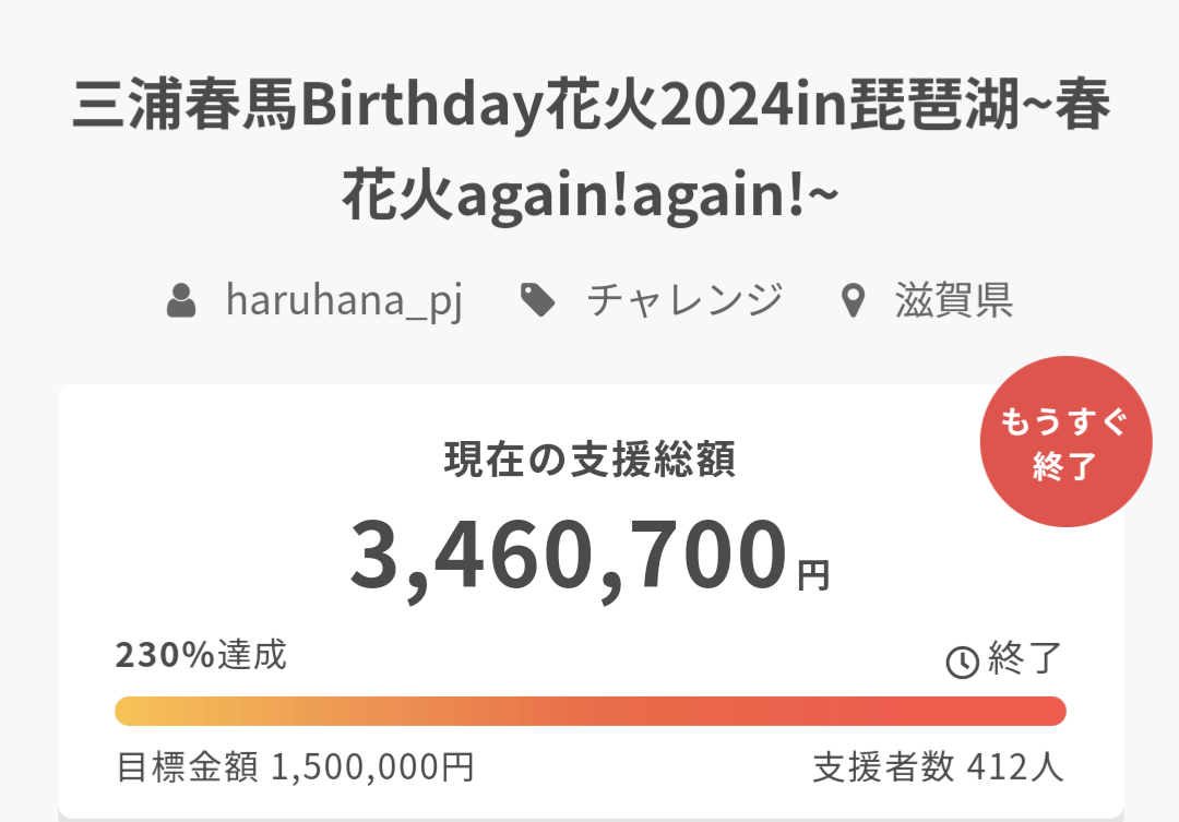 三浦春馬Birthday花火2024inびわ湖クラウドファインディングを完走させていただきました。主催者がびっくりするほどたくさんのご支援を賜り、感謝の気持ちでいっぱいです。ご支援くださいました皆様に心より御礼申し上げます。